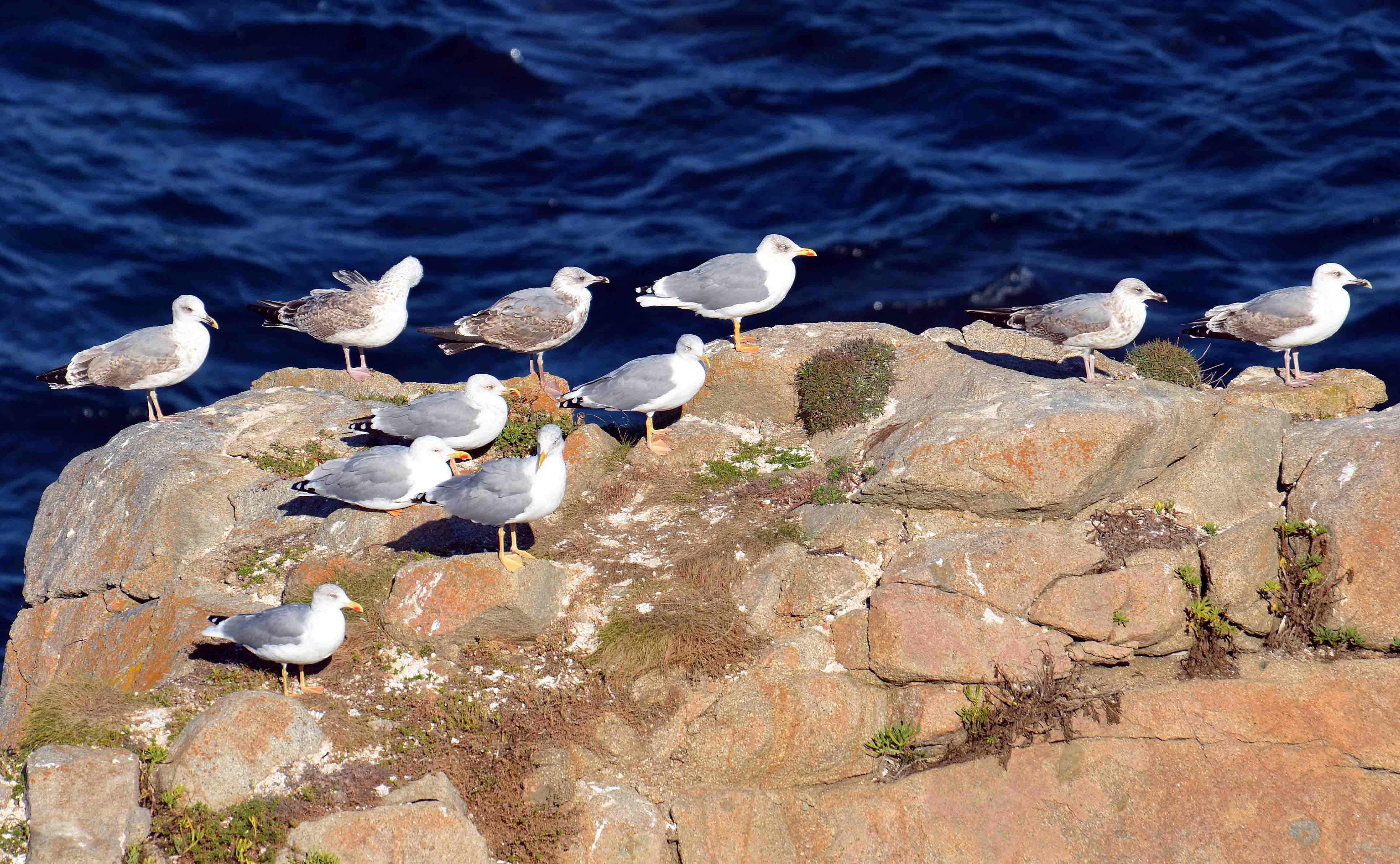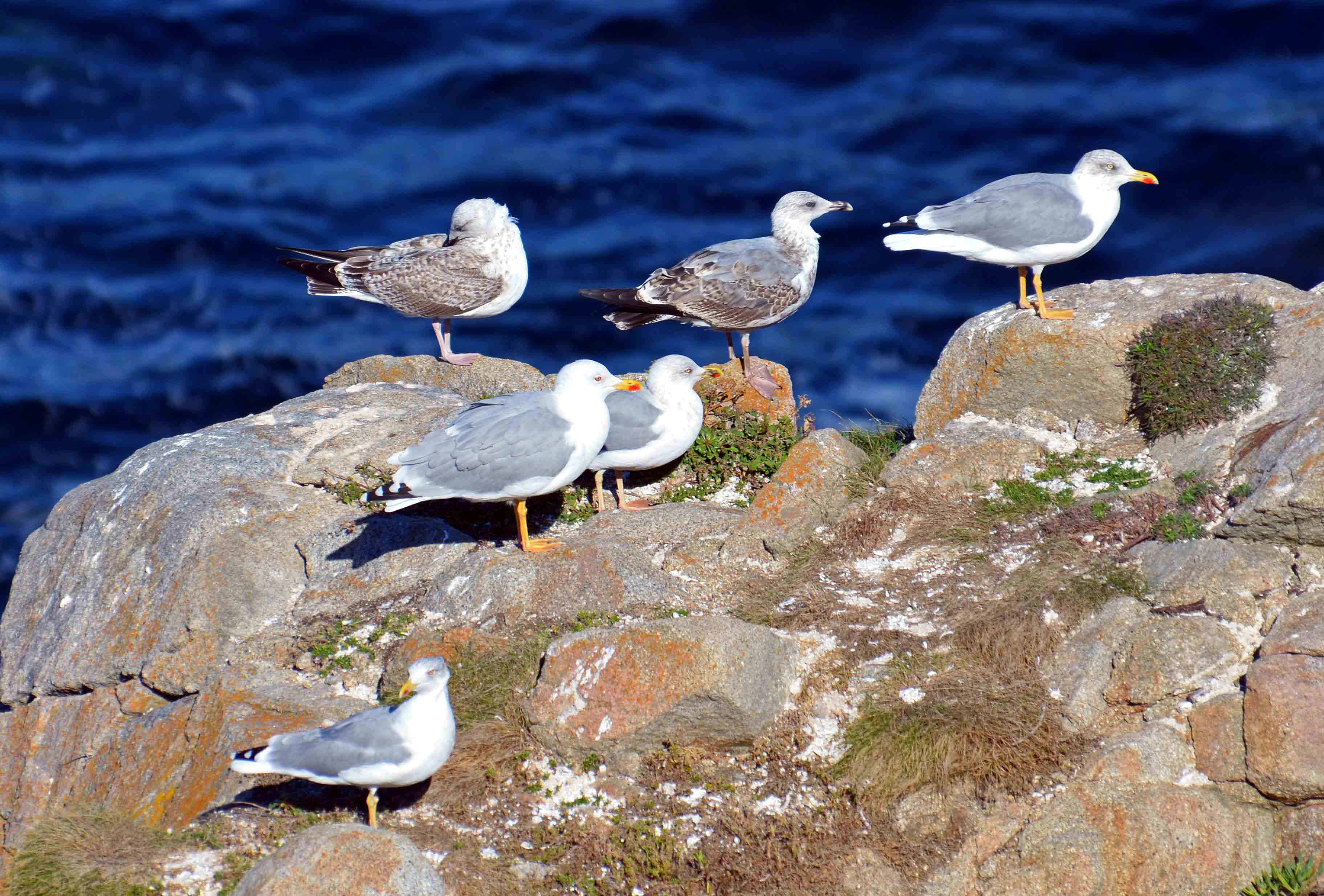 Yellow-legged gulls (YLG) have probably been around for quite a long time, but they have only recently been recognised by us humans as deserving a species of their own! Larus michahellis. Not being an expert birder, they look to me like Herring gulls with yellow legs, but watch out because 1st year birds can have rather pink legs, just like Herring gulls! They were originally considered to be a race of Herring Gull. I see them regularly in Galicia, N W Spain, which probably means that these are the Atlantic subspecies of YLG, but I leave that to the experts. They are however, a beautiful gull, especially the adults with their bright yellow legs, bright yellow bills with a large red dot (for pecking!) and beautiful grey backs. These photos were taken on 8th October at a northerly point called Cabo (or Cape) de Bares, which is a good sea-bird watching point. Having said that, I seem to be the only one watching sea birds whenever I go there! These photographs show some birds entering their 1st, 2nd and 3rd winters, as well an adult with an all white head.