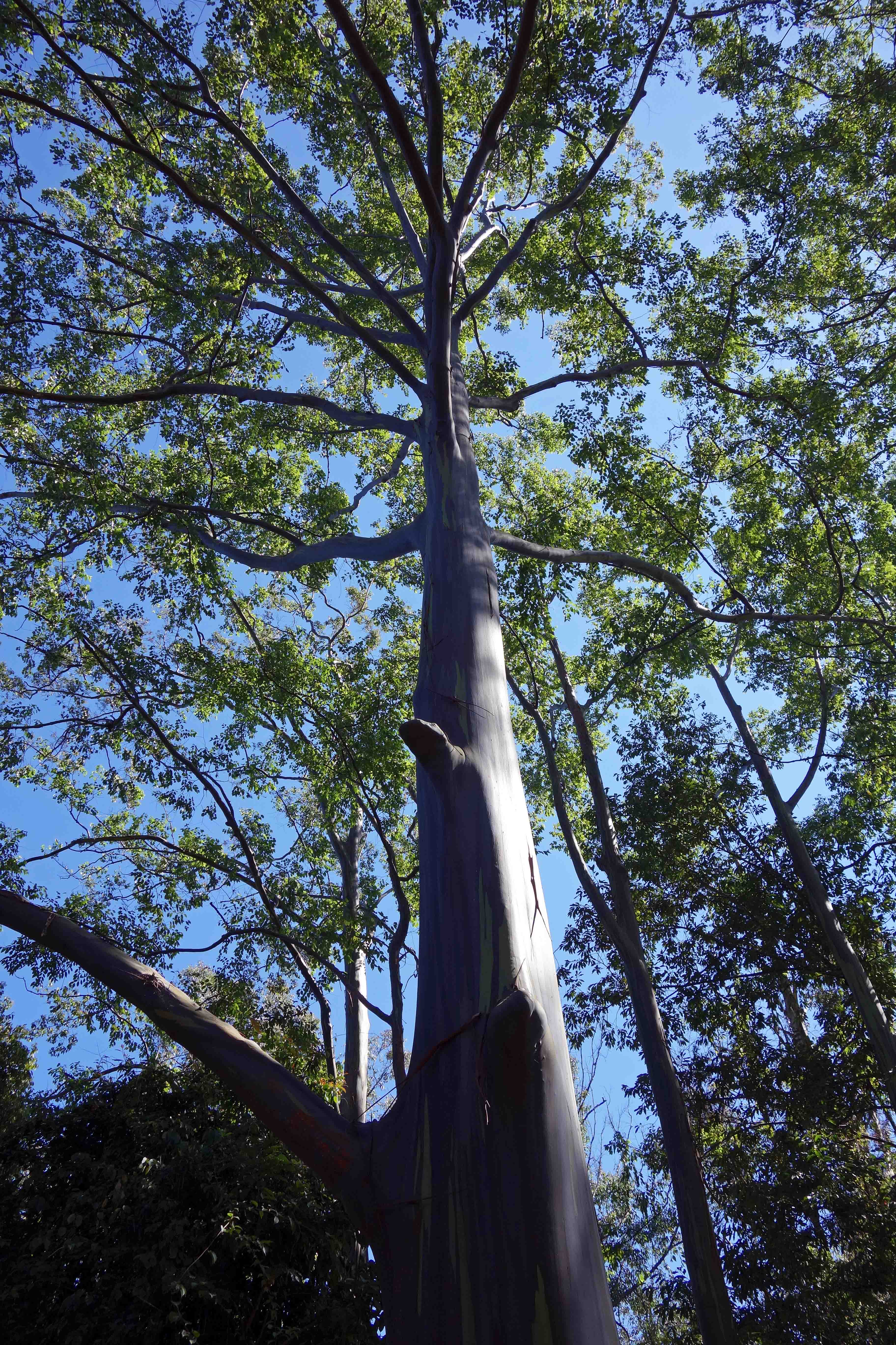 The Rainbow Eucalyptus tree is a strikingly colourful eucalypt which originated from South East Asia (the native distribution covered: New Britain, New Guinea, Ceram, Sulawesi and Mindanao) (1). It is a member of the family Myrtaceae, and it can now be found growing throughout the tropics, because as well as being beautiful, it is a very fast growing timber species and is also used as a shade tree for growing coffee. The multi-coloured bark is produced by the shedding of patches of bark, which first reveal a bright green inner bark. This then changes to give blue, purple, orange and maroon tones as it presumably dries out and is eventually shed.