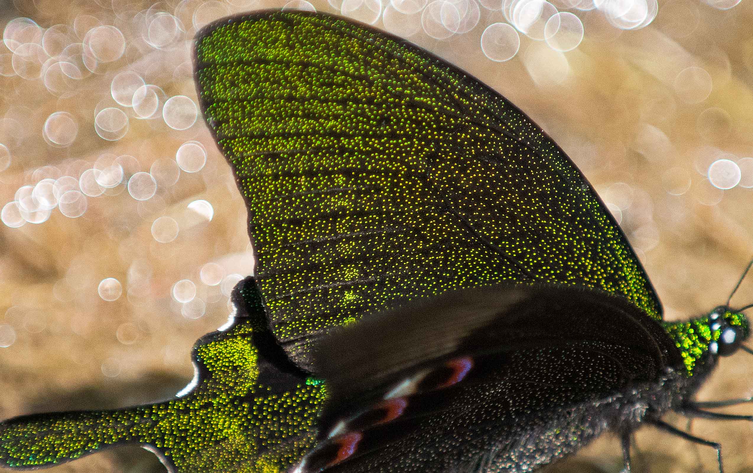 I cropped some of the images to show, in detail, the small green wing scales which give the butterfly its overall green colouration.  These very bright, light-reflecting scales are set on the dark background of the wings, and are found on the ventral (upper) surfaces of both the fore- and hindwings, as well as on the body (below).