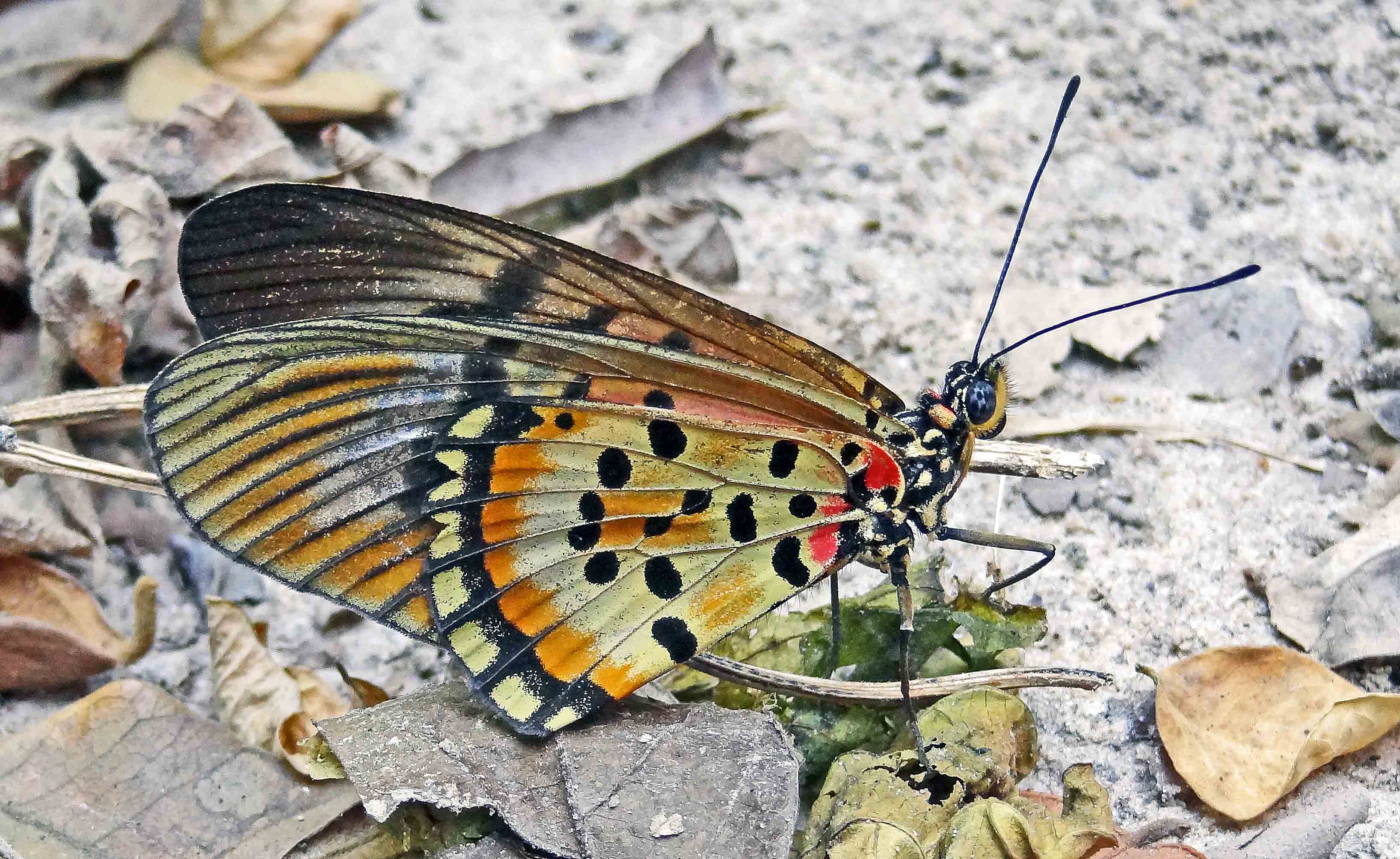 Butterflies in the genus Acraea – such as the Acraea Elegant, Acraea egina, feed selectively on plants with cyanoglycosides (poisons!) belonging to plant families such as the Passifloraceae (the Passion Flower family). So they are brightly coloured to advertise that they are poisonous, or at least distasteful to birds and other predators; and as such they serve as ‘models’ and are ‘copied’ in apearance by other butterflies which are not poisonous, i.e. Batesian mimics.  An evolutionary strategy to benefit from another species without having to go through the process of eating all those nasty poisons oneself!    Acraea egina is mimicked very closely by another nymphalid, called  Boisduval’s False Acraea, Pseudacraea boisduvali, and by a swallowtail, Papilio ridleyanus!