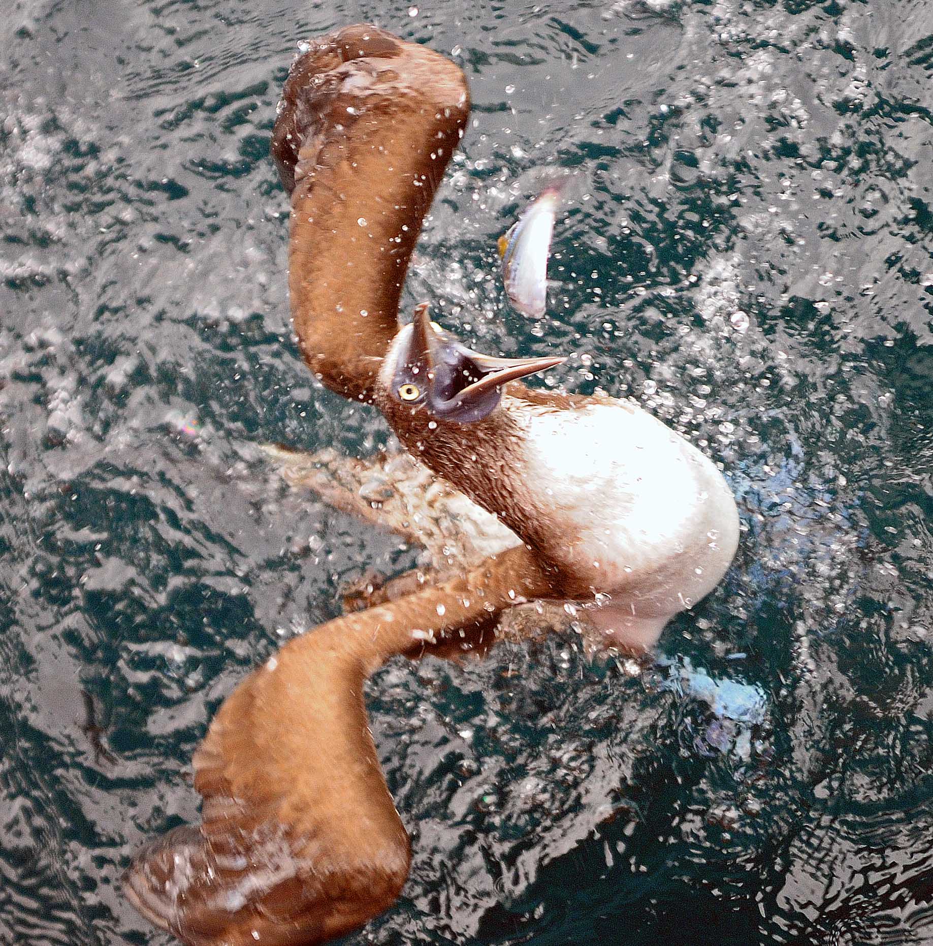 Frigatebirds are often called the pirates of the sea, because they rob other birds – such as boobies – of their catches, snatching the fish just as they return to the surface!  This blue-footed booby (below) shows how easy it would be for a frigatebird to snatch a fish – luckily for this bird, there were none around!