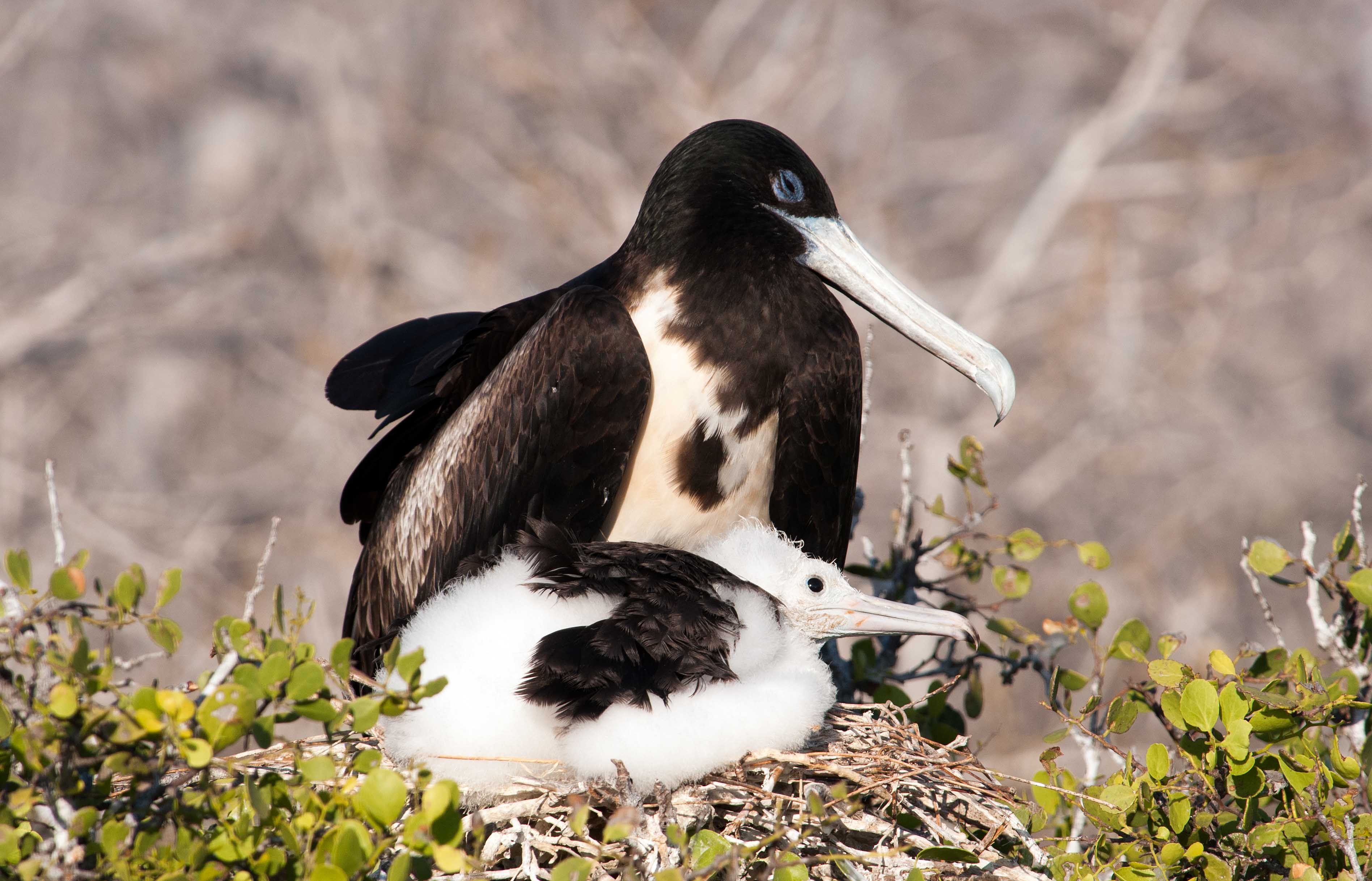 Frigatebird colony, with some brown-headed juveniles, North Seymour