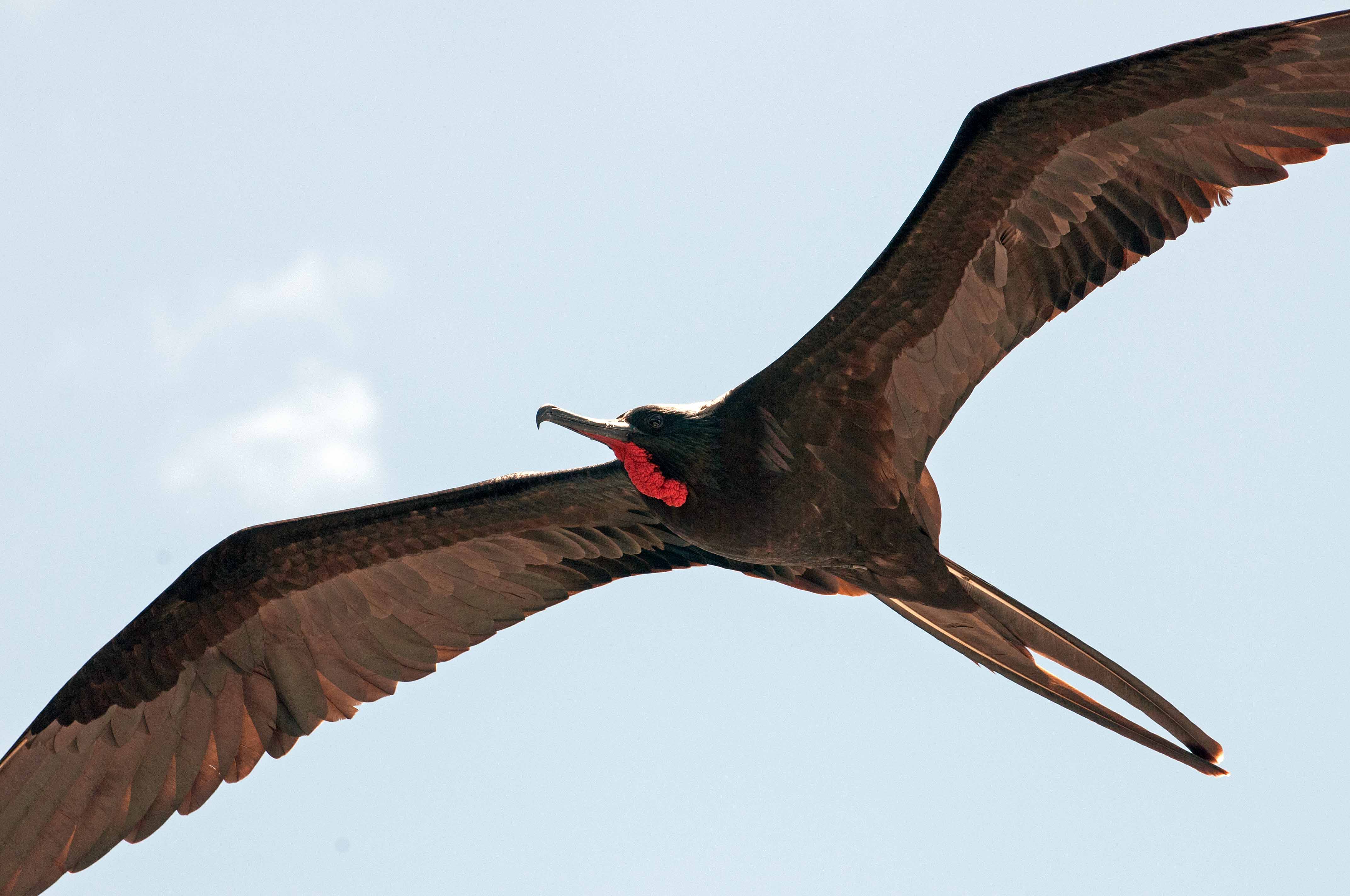 Frigatebirds usually forage alone like this single male (below), or in pairs, but larger aggregations occur nearer to the breeding colony or where there is an abundant source of food, such as behind fishing boats.   It is said, that frigatebirds have the largest wingspan-to-body weight ratio of any bird, and when they soar above ships they really do look like living hang gliders!