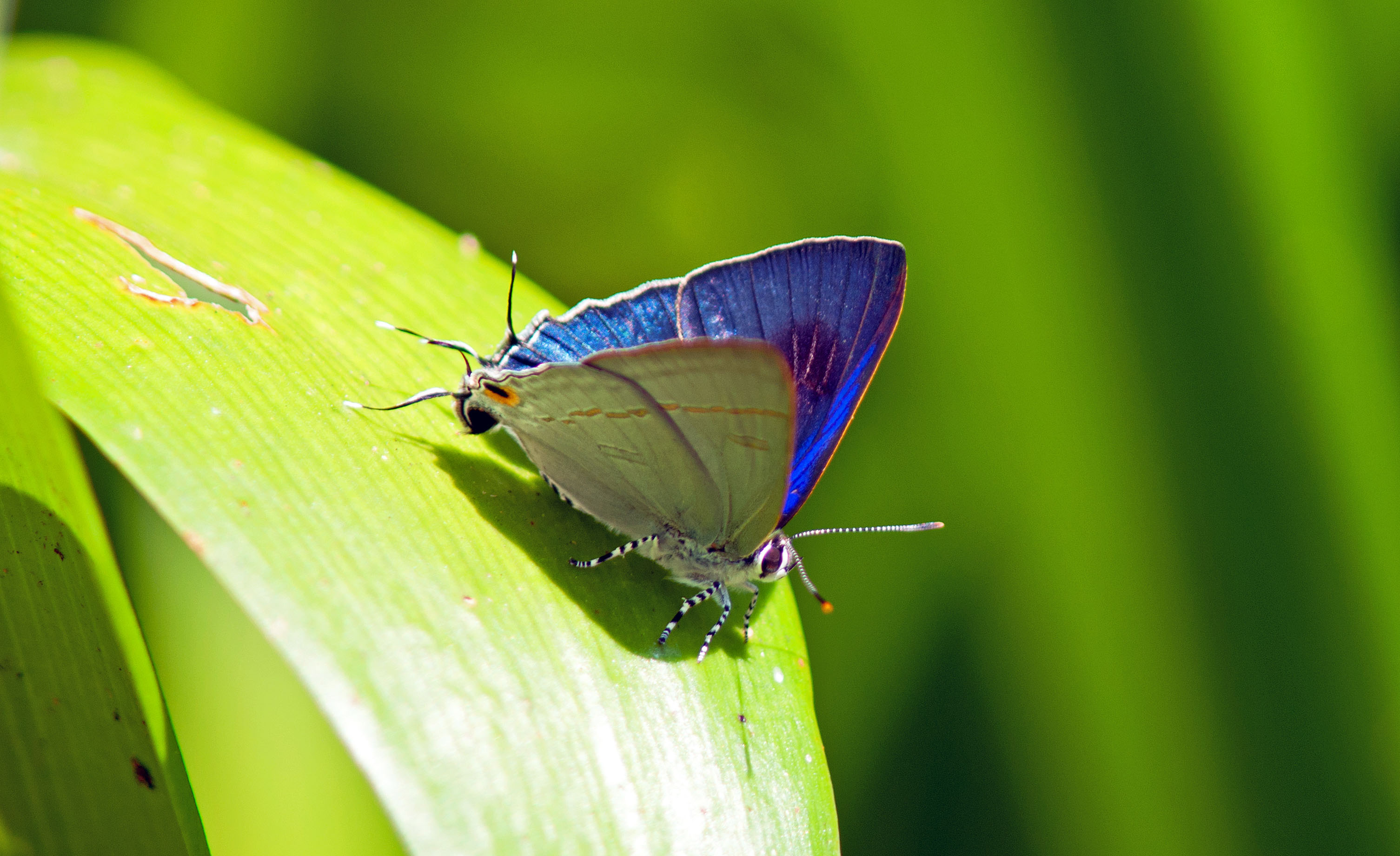Whilst photographing this striking butterfly – The Common Tit (Hypolycaena erylus himavantus) in Thailand – I noticed that it was moving the tails at the end of its wings.  The movement was quite noticeable; the little black ‘tails’ with white tips, moving up and down. This behaviour not only draws attention to the back of the animal, but the tails also look surprisingly like antennae. According to the ‘false head’ hypothesis, butterflies such as these – lycaenids – have evolved the appearance of a false head at the back end, so that predators such as birds, will direct their attacks towards this, the less vulnerable part of the insect (1). The effect is presumably reinforced by the eye-spots at the end of the hind-wings, which may also tempt birds to peck at those places (and not at the head). The tails are best seen in profile, when the black spots on the hindwings – false eyes – are also most apparent (2). So the butterfly becomes a sort of pushmi-pullyu (push-me—pull-you) creature, a  Doctor Dolittle animal with two front ends that looks like it could go either way!