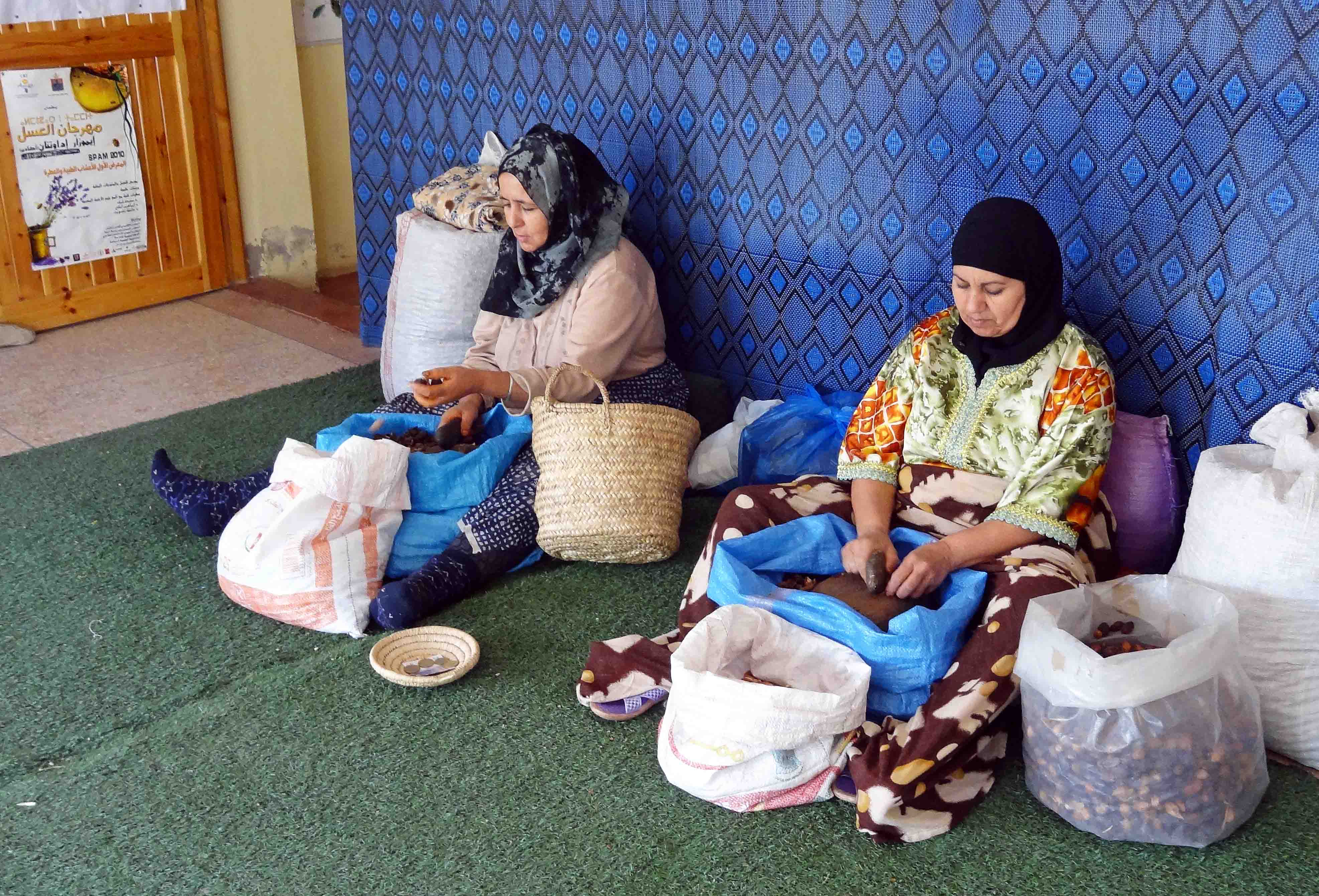 Argan trees (Argania spinosa) are endemic to  SW Morocco and Algeria and the natural arganeraie forests are quite restricted, so the annual production is small (a few thousand tonnes of oil). Argan oil is produced by removing the soft outer pulp of the argan fruit and then cracking the hard inner nut by hand, between two stones, to obtain the oil-filled seeds. This is traditionally women’s work in SW Morocco (below), but it has reportedly enabled them to achieve some financial independence, benefiting themselves and their children.