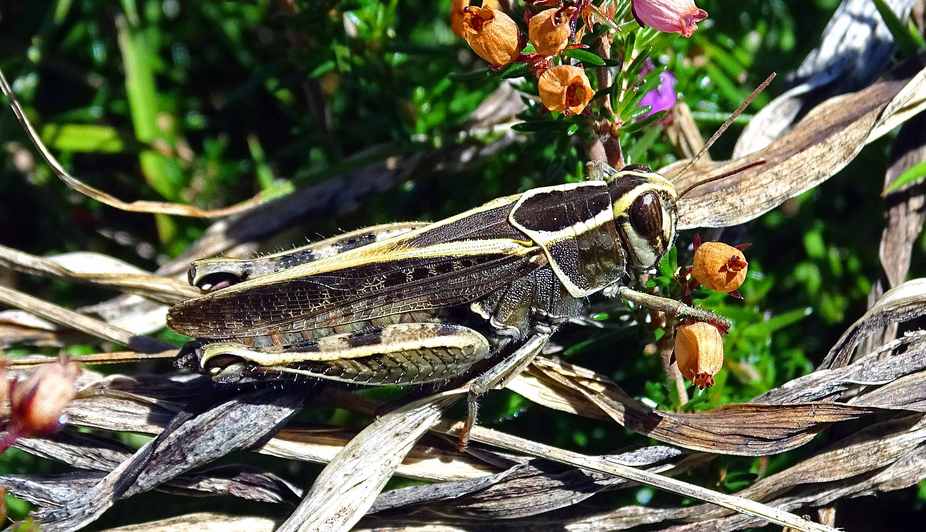 In flight, these grasshoppers are quite distinctive on account of their red wings. But at rest, with wings folded, they are perfectly camouflaged against the dry vegetation. Another feature that is not apparent in this photograph is the colour on the inside of their legs! One might ask why is this important? Well there are apparently two different forms (or bio forms) which are differentiated by the colour of the inner side of the hind femora (1). In one form, the inner side of the hind leg is a ruby colour (and has three black spots); the other form, has pale orange inside legs (with only one large black spot). The two forms also make different mating sounds (songs?) by grinding their mandibles together (1). The orthopteran equivalent of grinding their teeth together?!