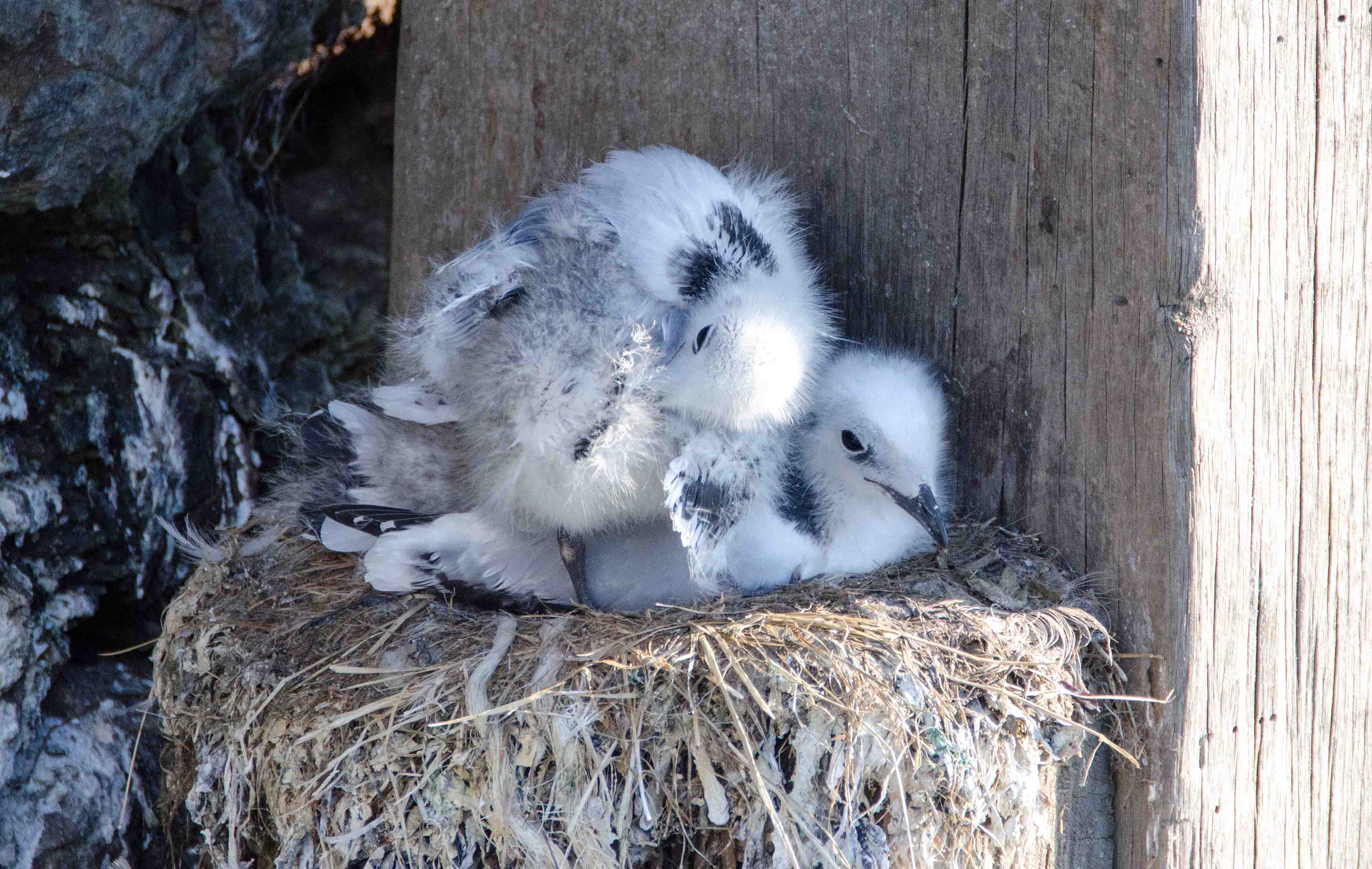 Black-legged kittiwake chicks with one parent bird, Scarborough harbour, 15-07-2015