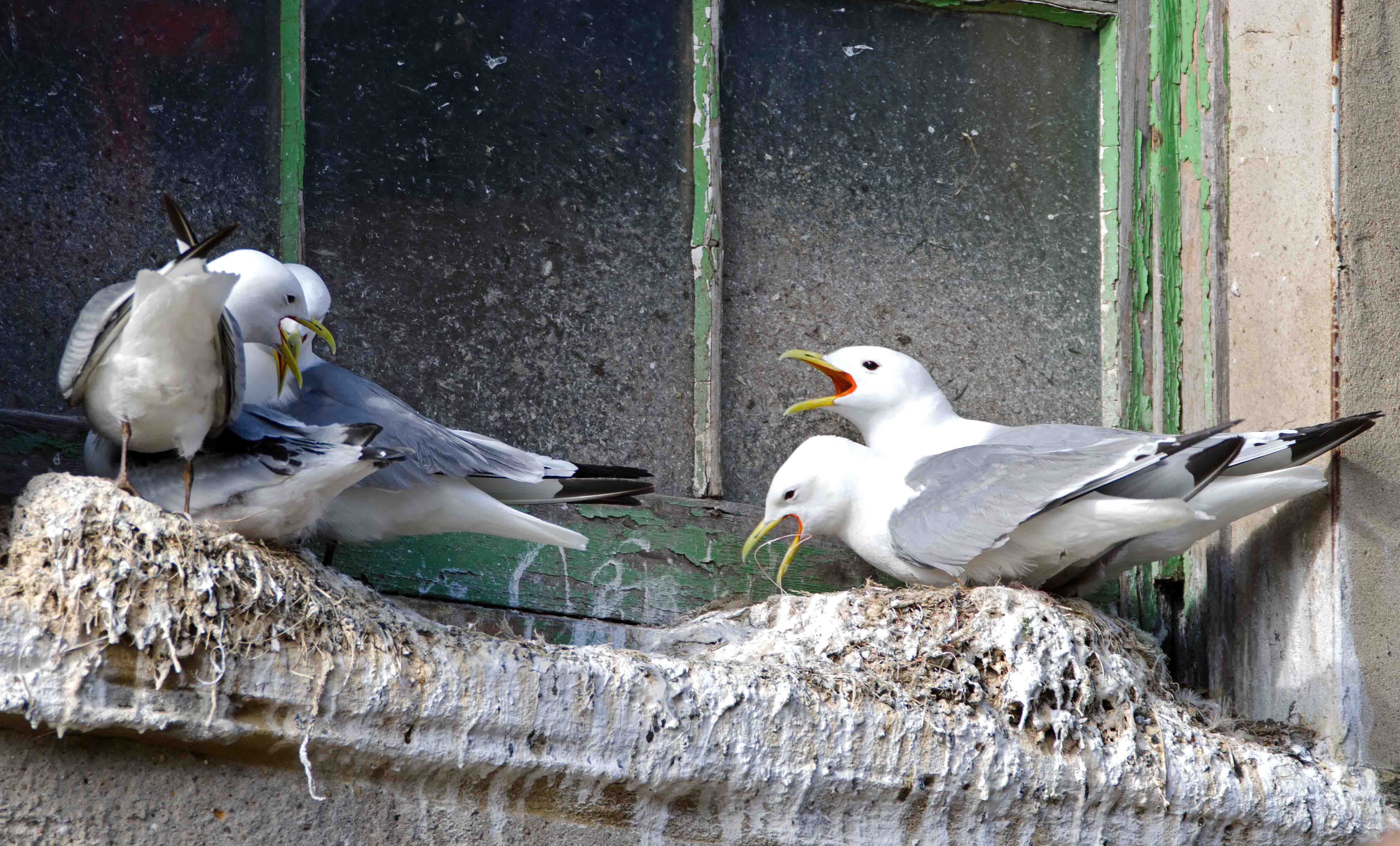 Kittiwakes nesting on widow ledge near the harbour, Scarborough