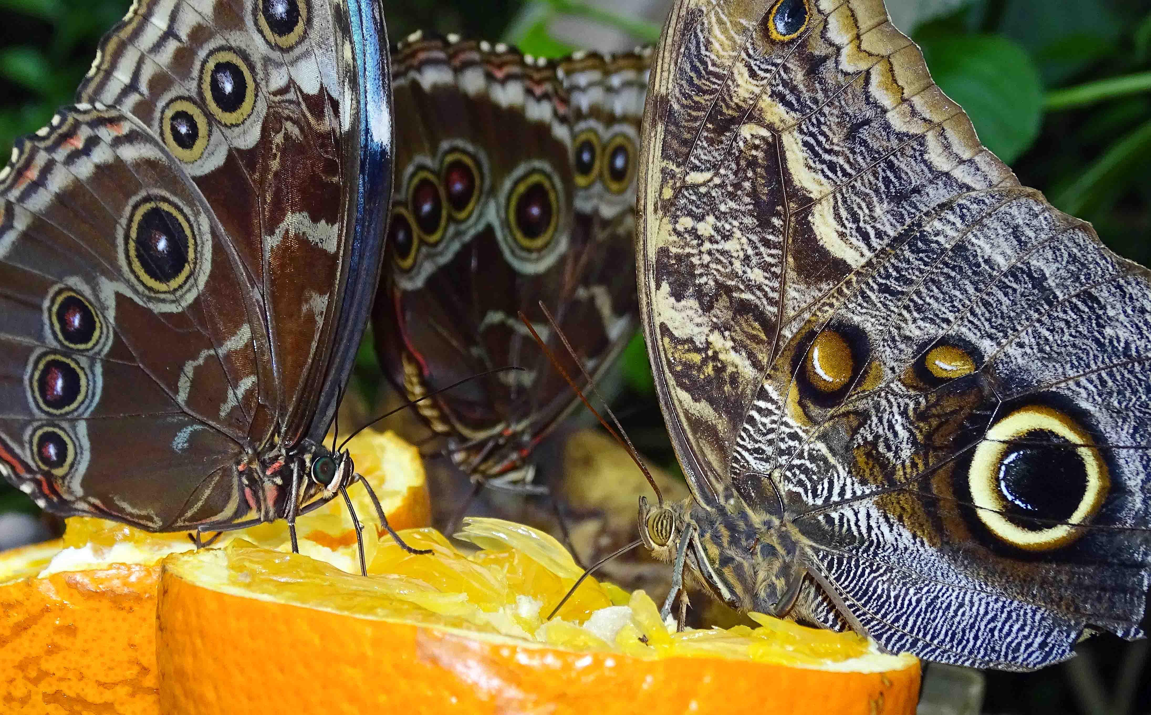 Turning to the stars of the show, Morpho peleides butterflies often gather together in groups (‘mobbing’), apparently to deter their predators; perhaps all those eye spots look intimidating! Interestingly, as Boppré and Vane-Wright point out, fruit-eating butterflies like these morphos really need rotten fruit, but since this ‘supposedly upsets the aesthetic sense of visitors to live butterfly exhibits….‘fresh’ fruit is often offered instead” (5). They rightly point out that it would be better to enlighten people about the real needs of the butterflies. So next time you visit a butterfly house and watch them feeding on some lovely fresh fruit, think of them forcing it down and wishing they could have some rotten fruit for a change!