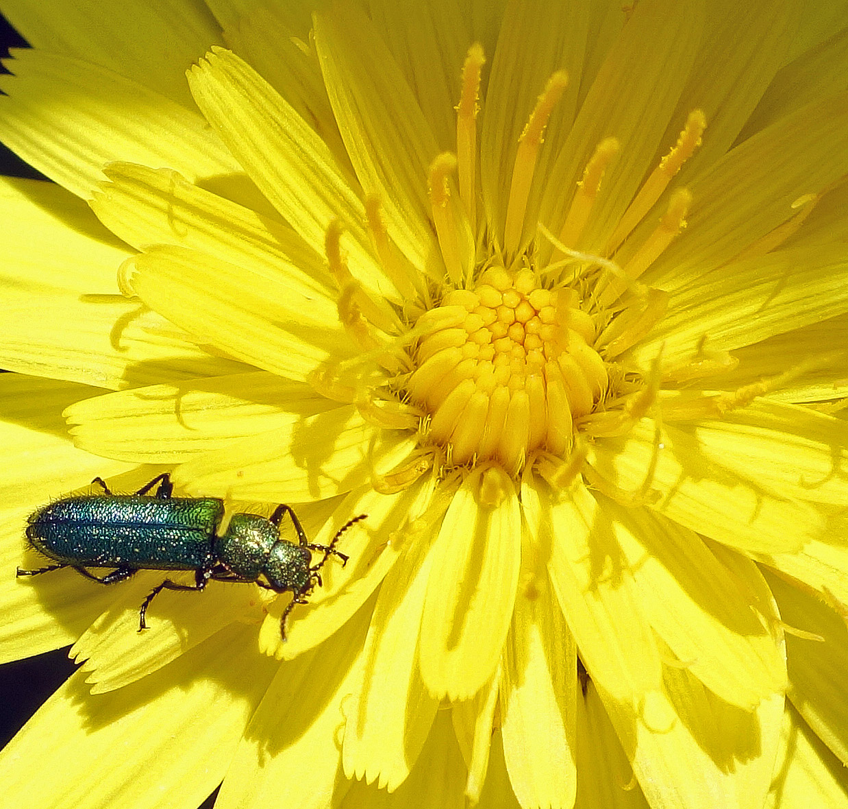 Some plants self-fertilise – i.e. sperm fuses with eggs from the same flower. Dandelions are among such plants – which can produce seeds without having to be fertilised – although they can also be sexual as well, relying on being fertilised by pollen carried from one dandelion to another by insects. The photo (below) shows a dandelion head composed of dozens of tiny florets, each with pistols bearing pollen, which can be picked up by visiting insects, e.g. bees.
