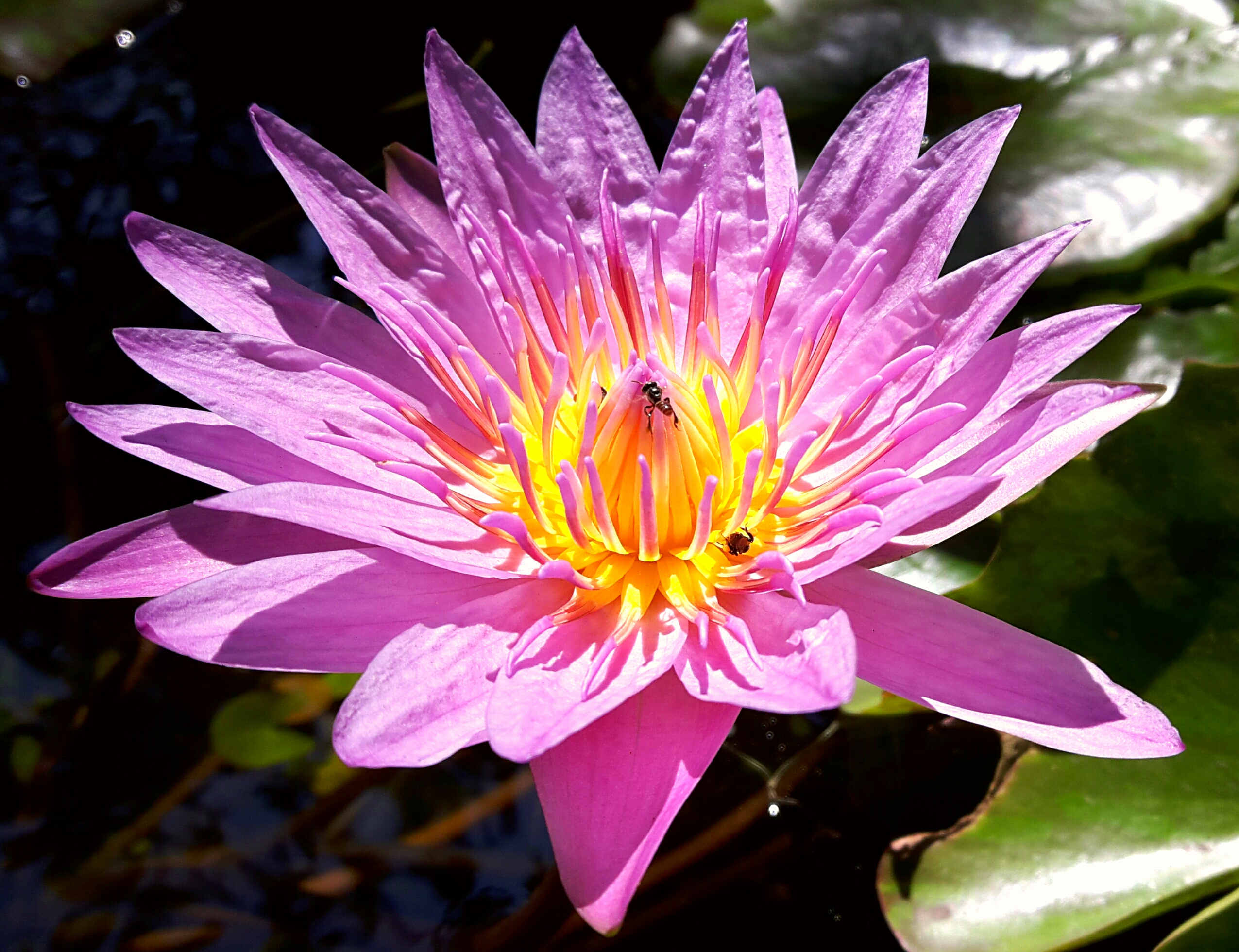 I noticed some tiny bees hovering around and landing on these water lilies in the garden of my hotel in Thailand. They might be pollinators or just harvesting pollen as one has a pair of small pollen baskets on its hind legs. Water lillies attract an array of pollinators including larger bees (1).