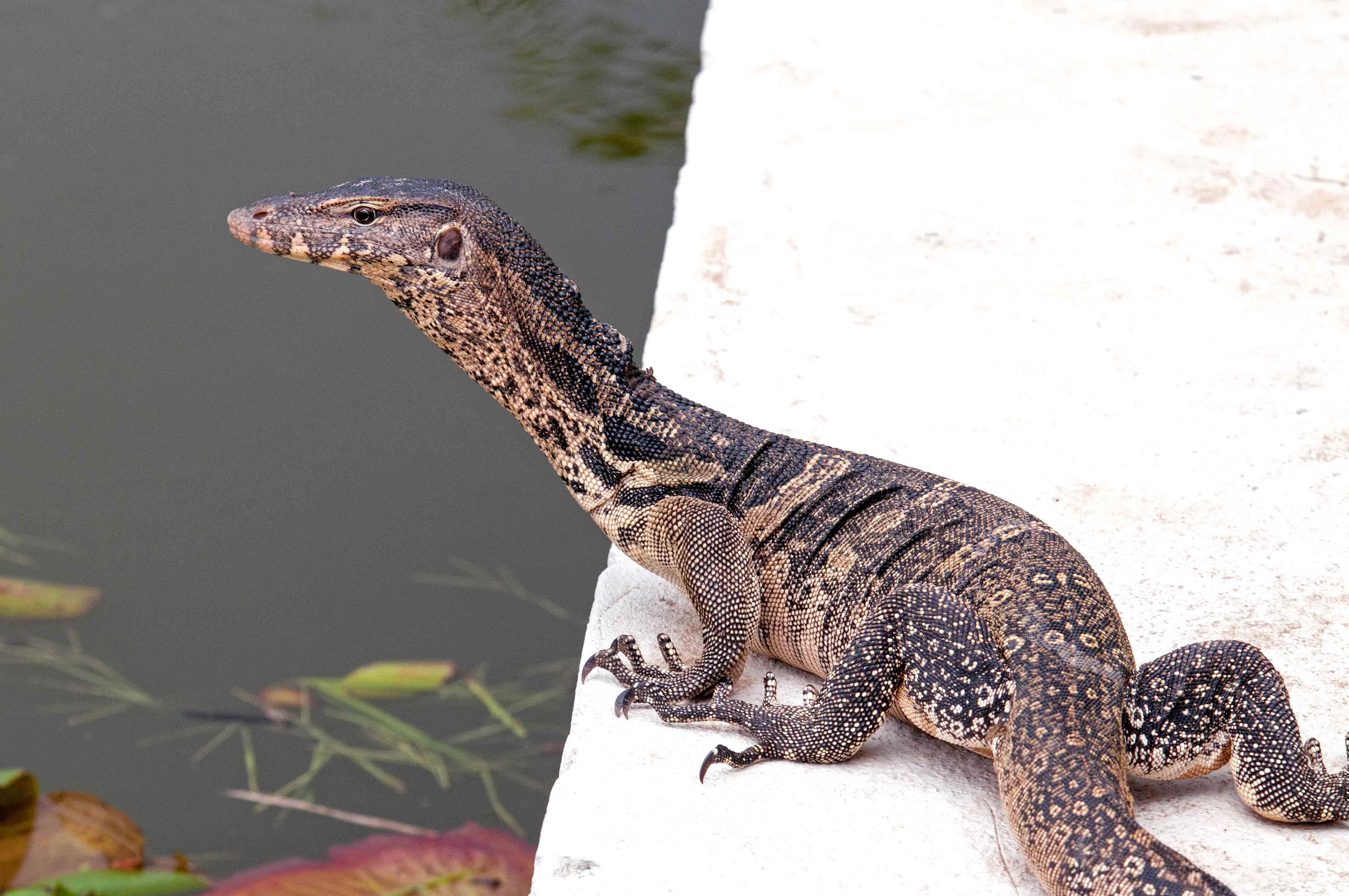 The Southeast Asian water monitor, a large lizard called Varanus salvator subspecies macromaculatus, occurs throughout southern Asia and Southeast Asia. It can grow very large, apparently up to 3 m in length, although most adults are about 1.5 to 2 m long (1). Big enough! The males are larger than the females and can weigh up to 50 kg. Their big cousins, the Indonesian Komodo dragons (Varanus komodoensis), are of course much larger and weigh up to 150 kg. Anyway, these Bangkok dragons are impressive enough.