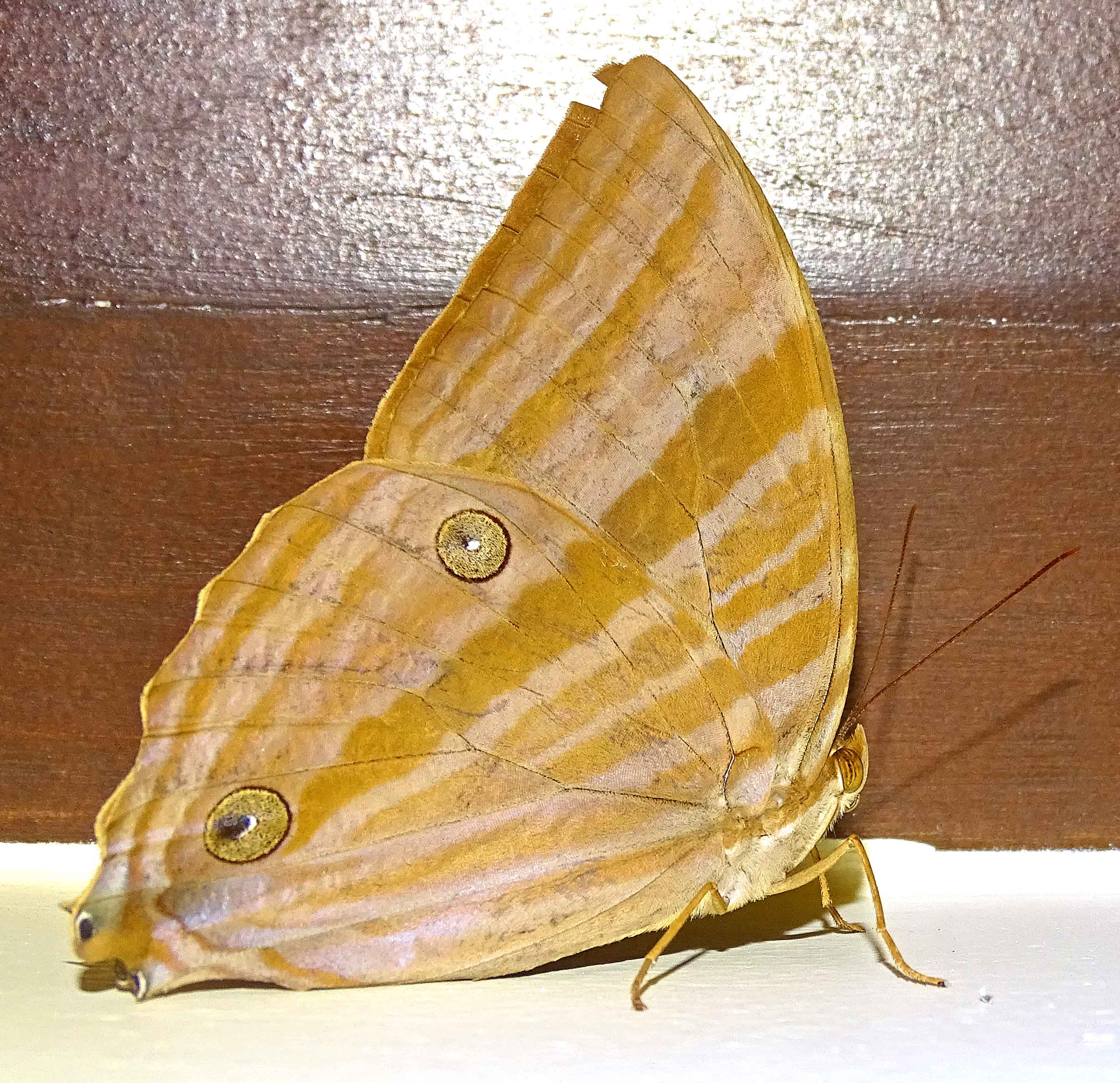 One night in April 2016, when I was in Sabang on the island of Palawan in the Philippines, I noticed a number of Palmking butterflies of the local subspecies (Amathusia phidippus palawanus). The next morning I came across a rather battered specimen (below) that had clearly had a run in with a predator of some kind, probably a bird. What stuck me about this butterfly was that it had been pecked right on the eyespot, or ocelli. There are two submarginal ocelli on the underside of the hindwings, and the distal one – situated the furthest away from the centre of the body – had been cut through by damage, presumably a peck of some sort.