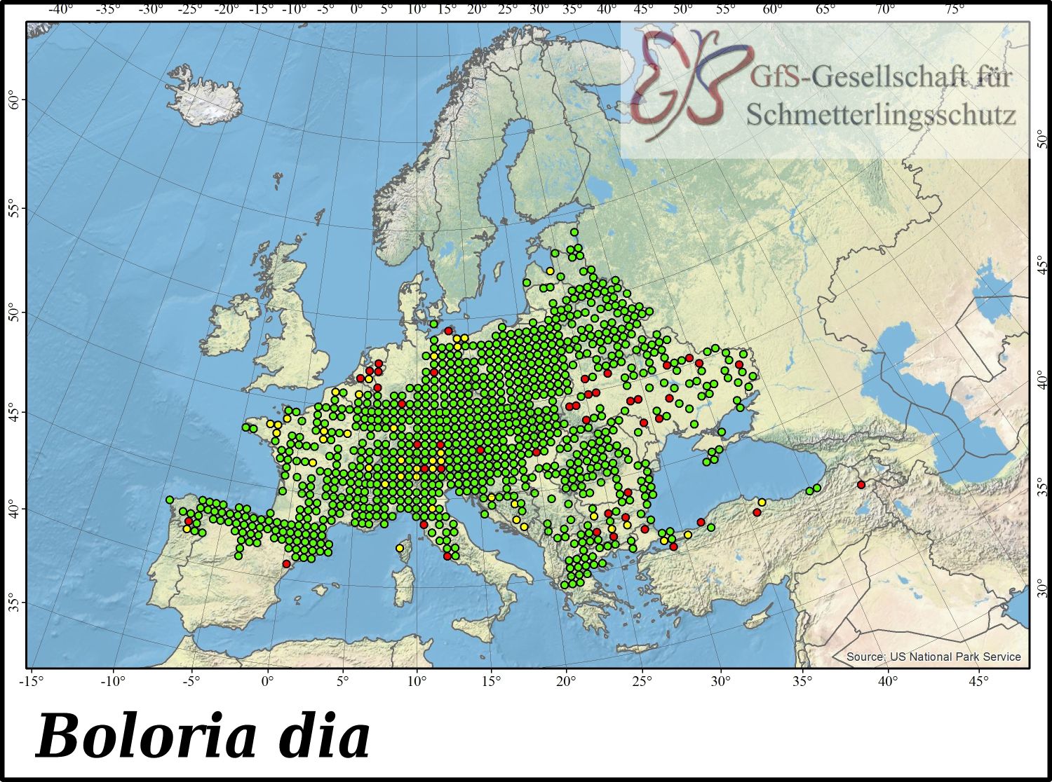 It is rather ironic that this little butterfly, which was named by a 19th Century British entomologist, does not occur in the UK! Weaver’s fritillary (Boloria dia) occurs throughout mainland Europe, and is found just across the Channel in northern France (see distribution map, below).