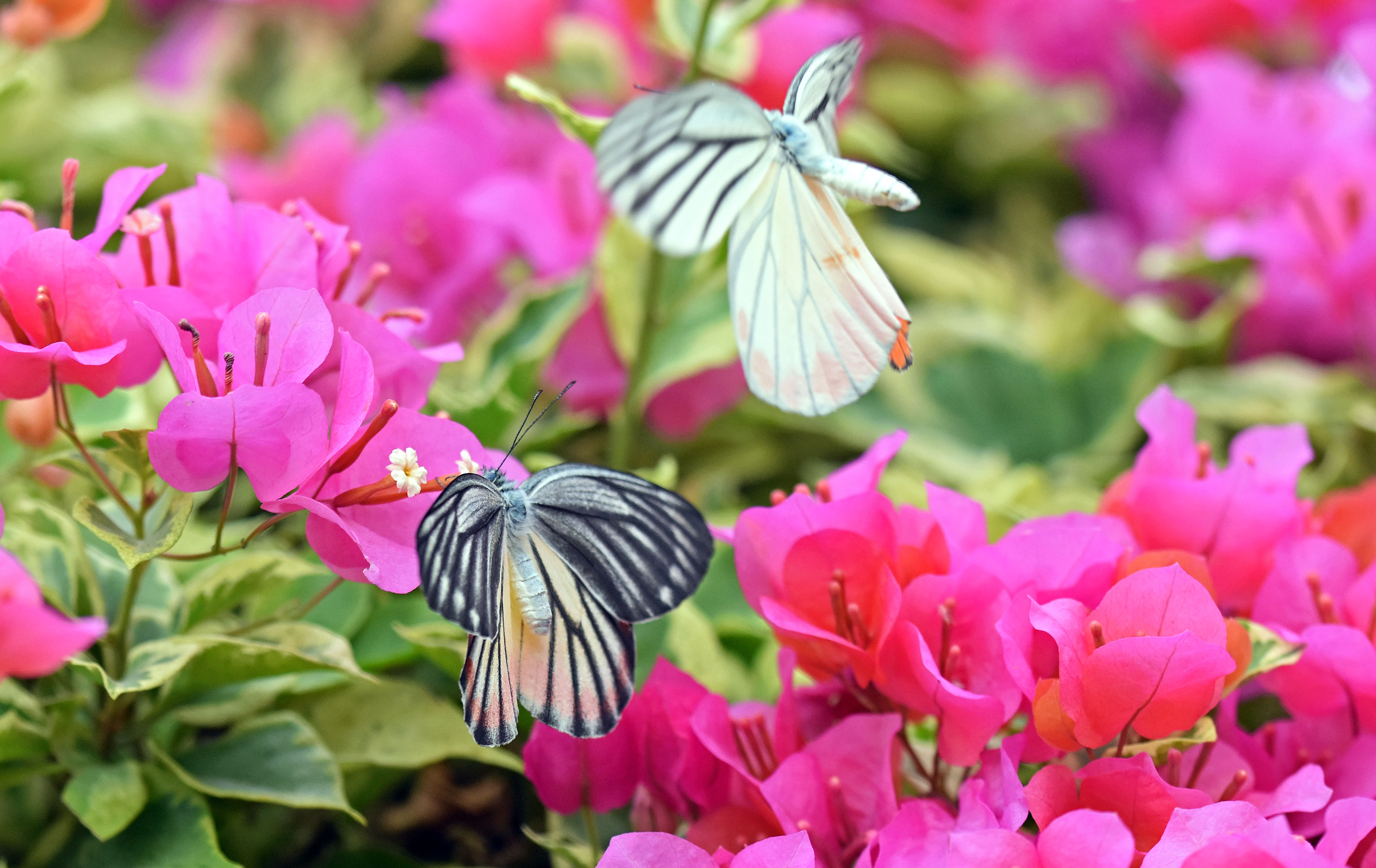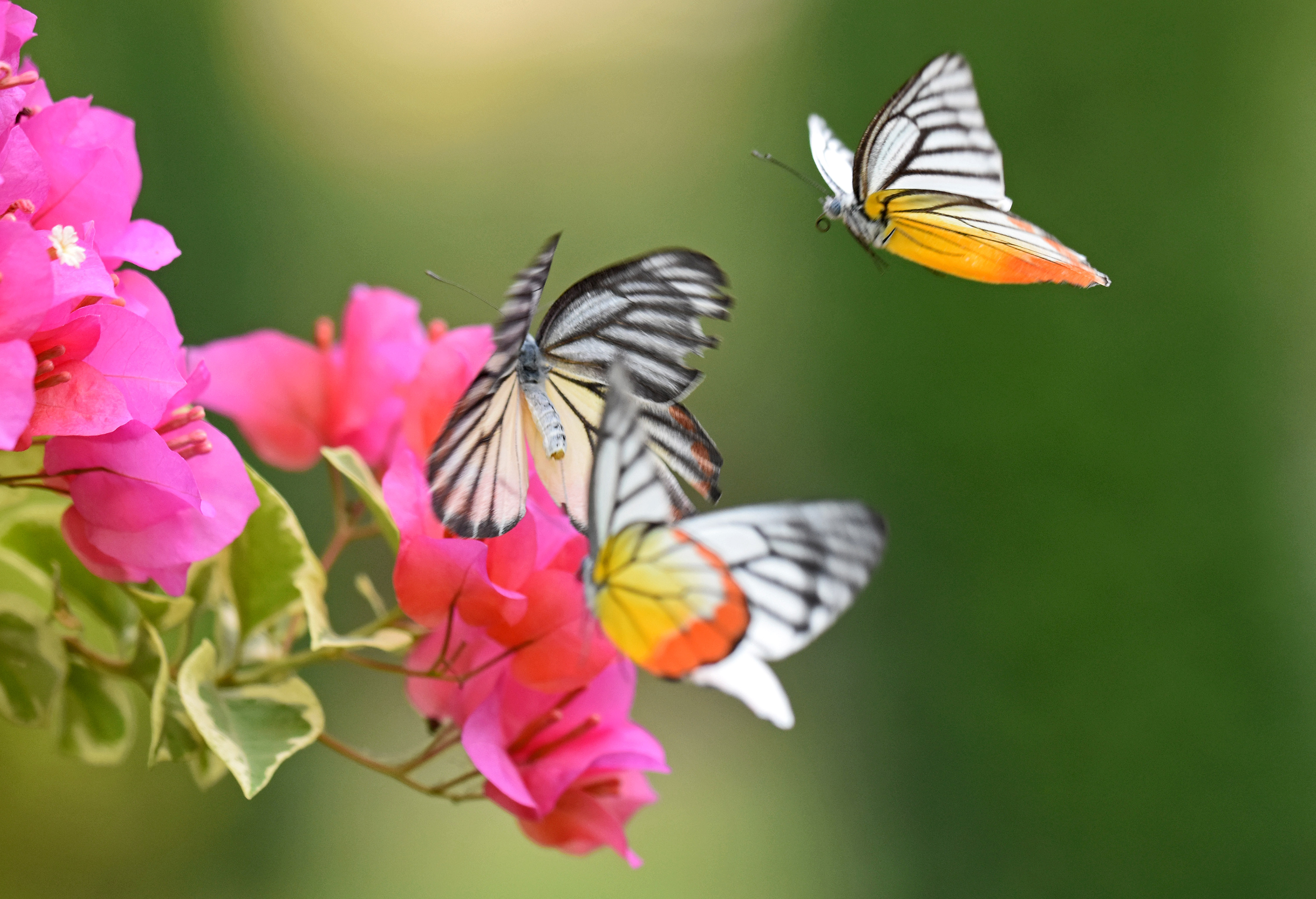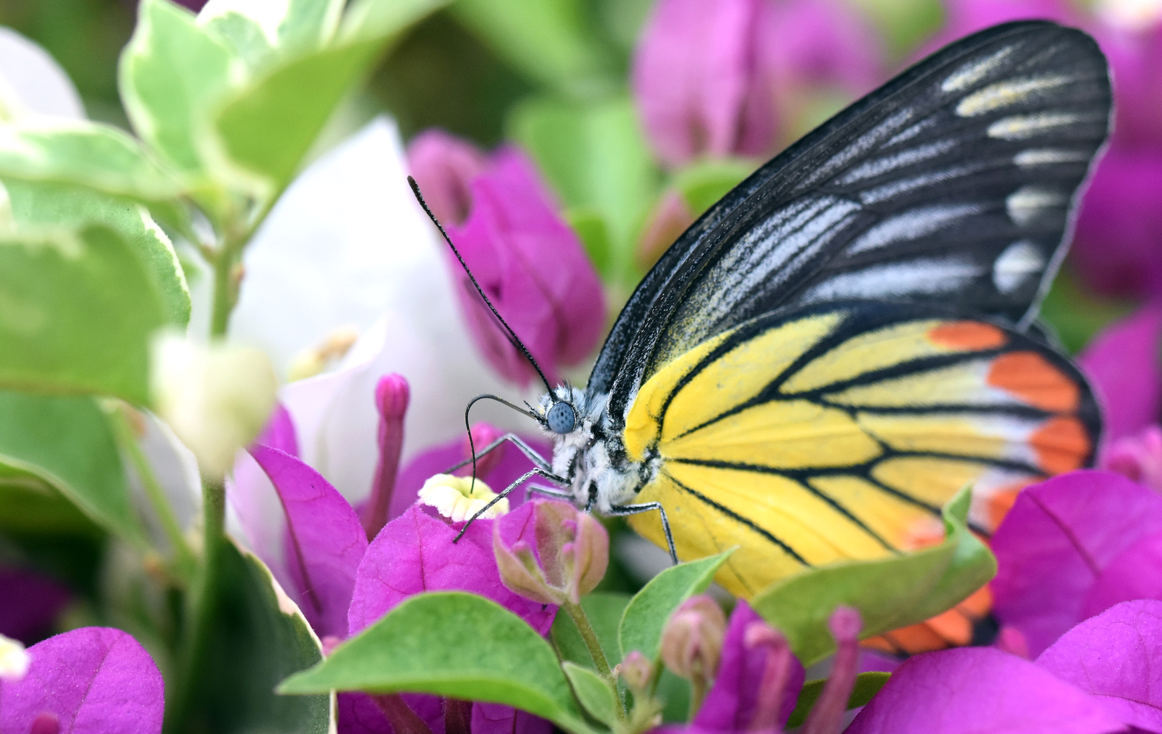I spent some time observing and photographing Painted Jezebel (Delias hyparete indica) butterflies feeding and courting on Bougainvillea flowers in Thailand. These beautiful and very common butterflies are often seen flitting around the tops of trees, coming down to feed on flowering plants later in the day (1, 2). Their ubiquity does not detract from their beauty.