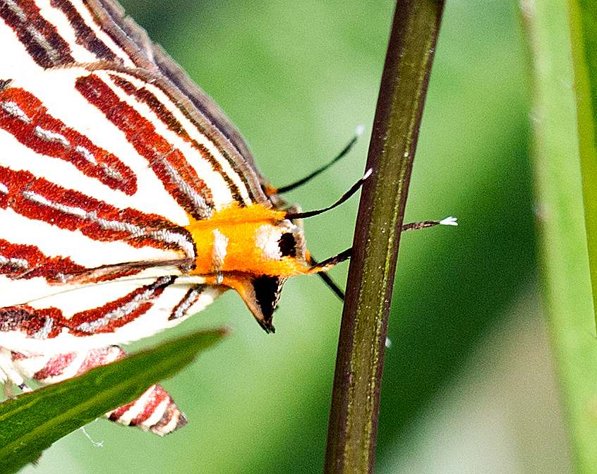 The fact that these butterflies invest so much time and energy into producing these deceptive structures and moving the little tails about like false antennae, is to my mind, quite convincing circumstantial evidence for their utility in avoiding predation, or surviving an attack. It is clear how prominent the ‘false head’ is – and might appear to a bird – when looking down on the butterfly from above (see photo below) like a bird might see it. The real head is partly hidden underneath the wings, but the ‘false head’ is very prominent.