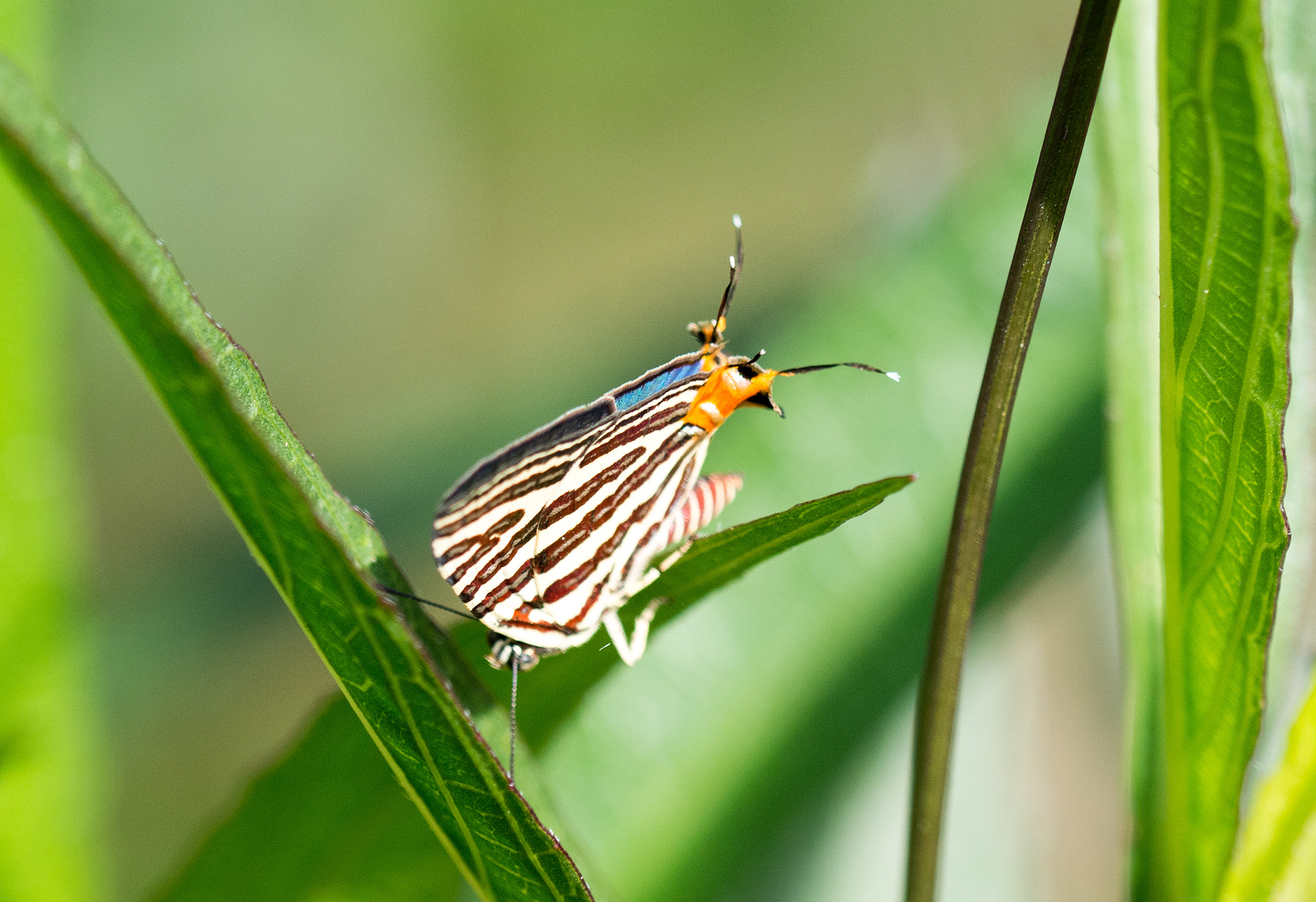 The Longbanded Silverline (Spindasis lohita), Family Lycaenidae, is a beautiful insect with a remarkable structure – a tail, or ‘false head’ – at the end of its hind wing. There is a bright orange tornal patch – the tornus is the posterior corner of the butterfly wing – on both sides of the wing. There is also a black eye-spot and two pairs of white-tipped, filament-like black tails, or ‘false antennae’, at the end of the wing. Interestingly, many lycaenids have similar black and orange eye-spots and single or double tails.  For example, the Common Tit (Hypolycaena erylus himavantus) also has white-tipped, double tails similar to this species (1). So presumably it was a feature that evolved at sometime during the history of this family. Black and orange make a very eye-catching colour combination.