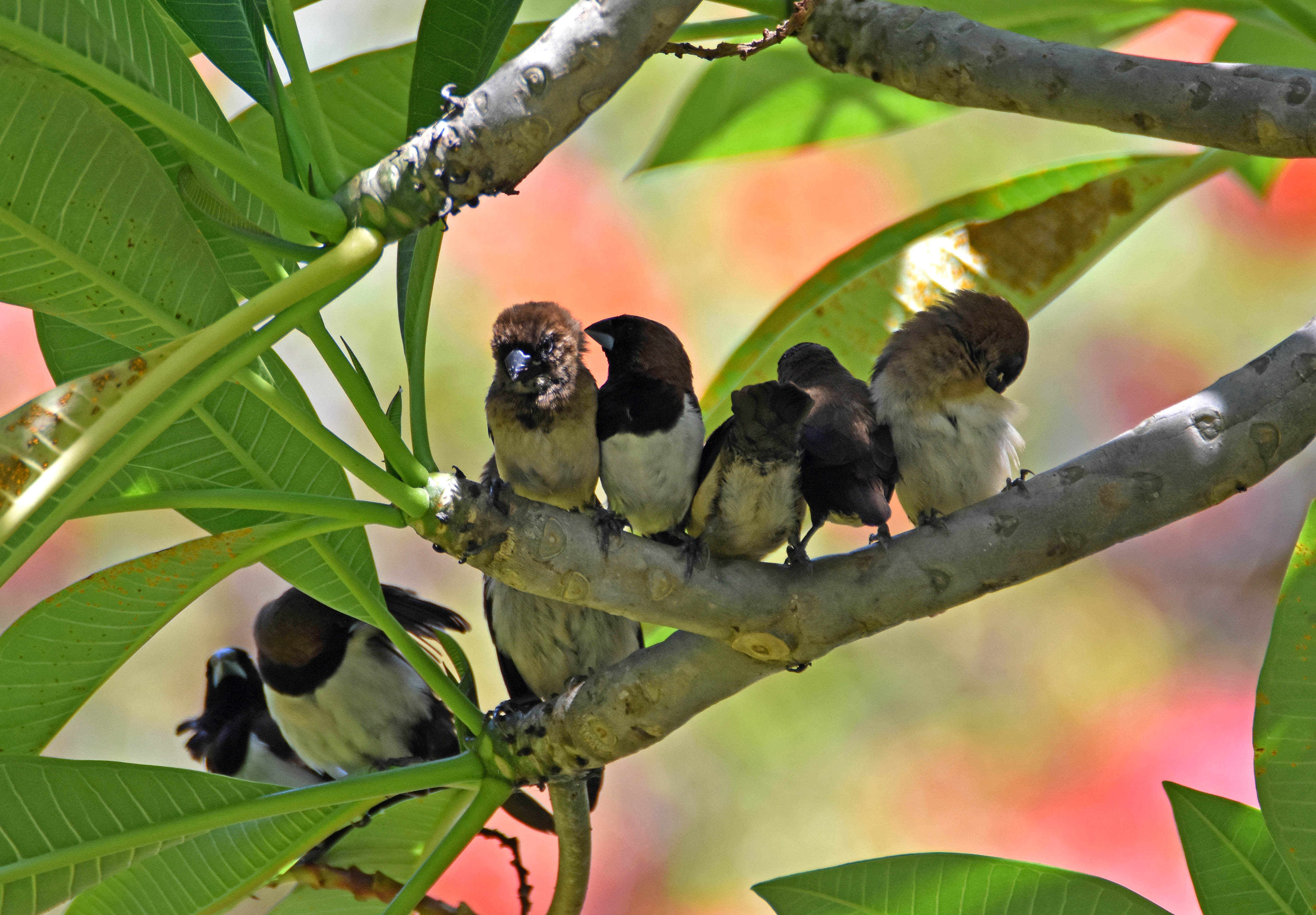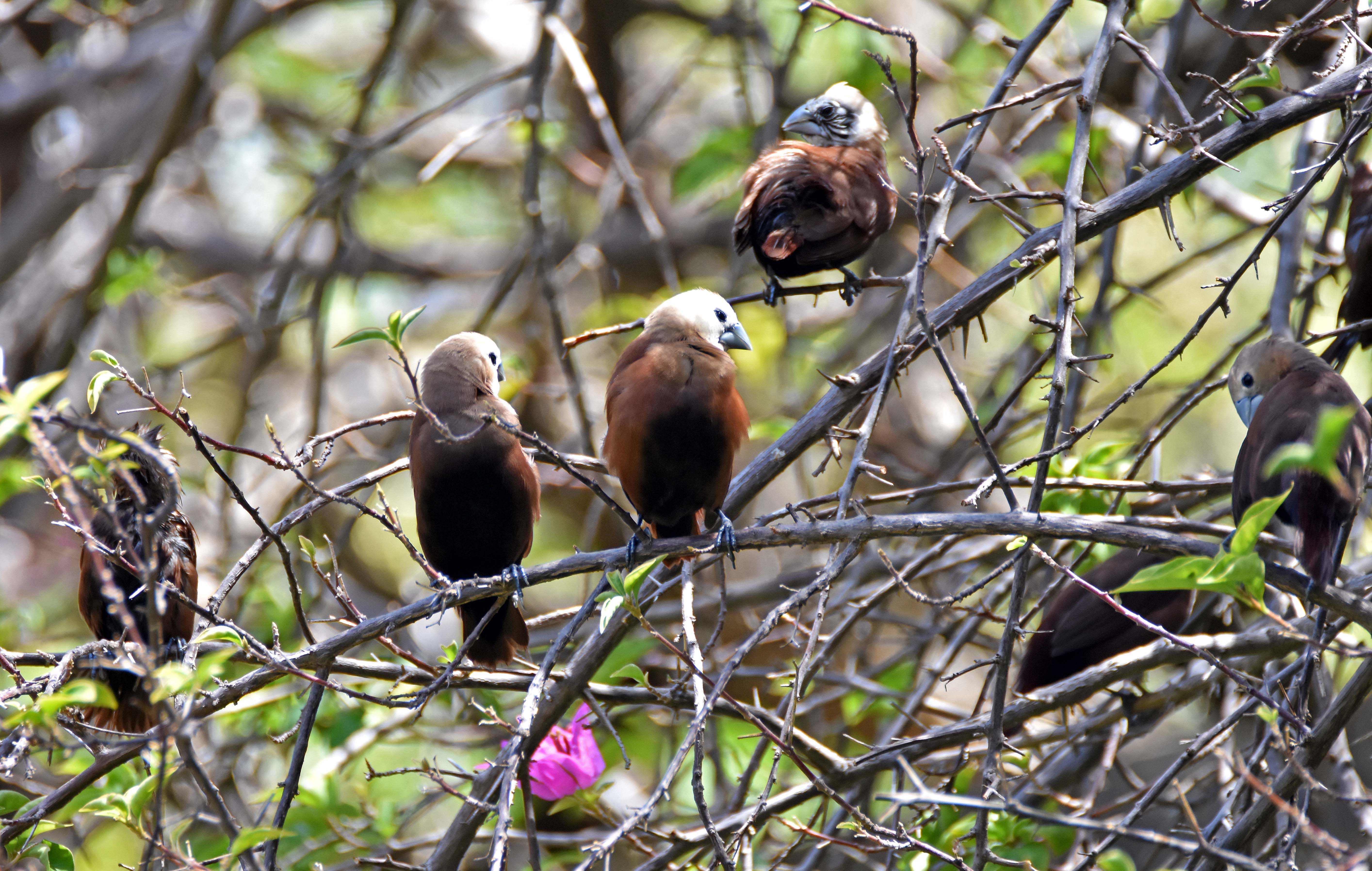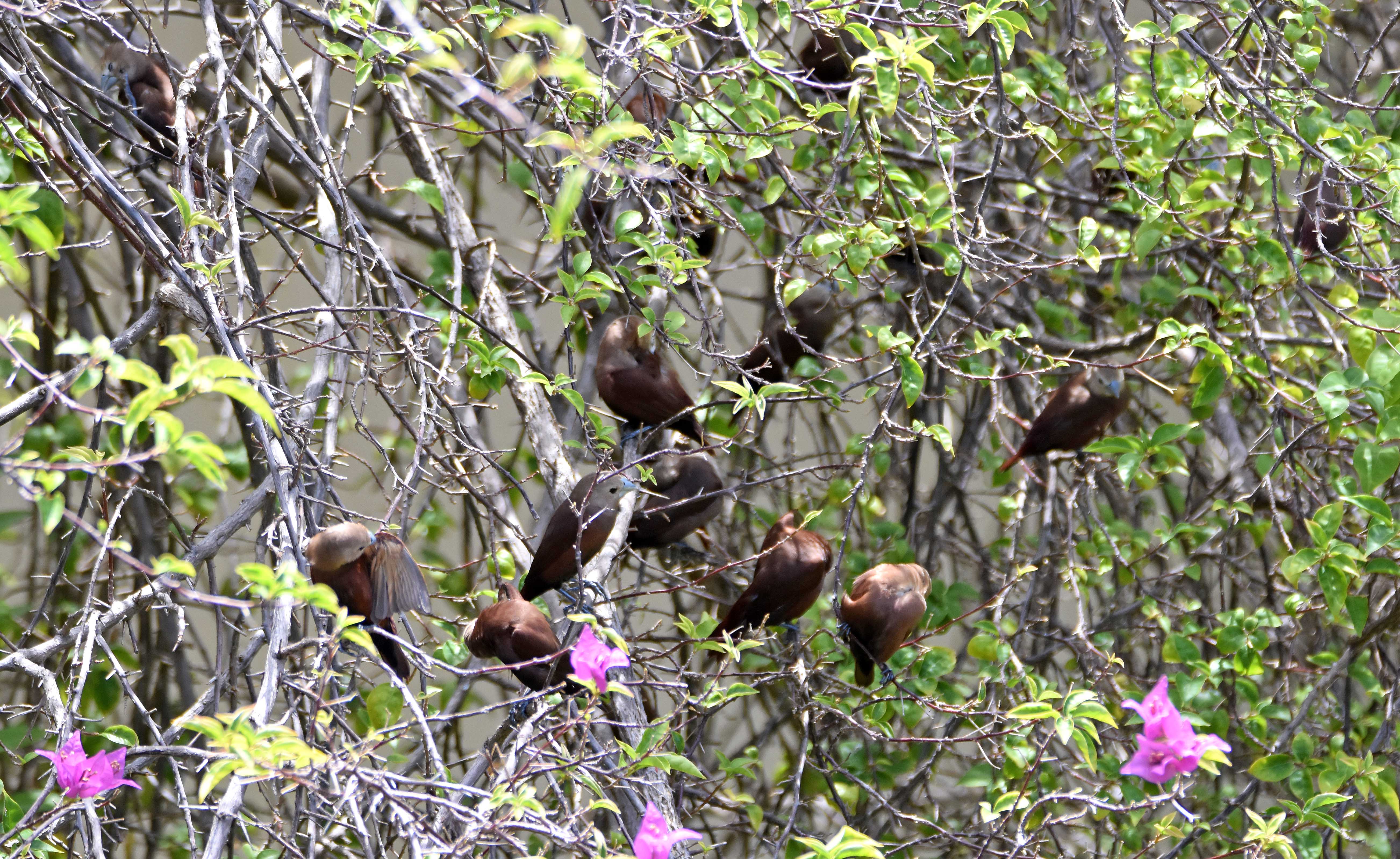 It turned out that these pair of White-bellied munias were parents; they soon joined the youngsters back under the branches of a near-by tree (below).