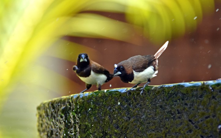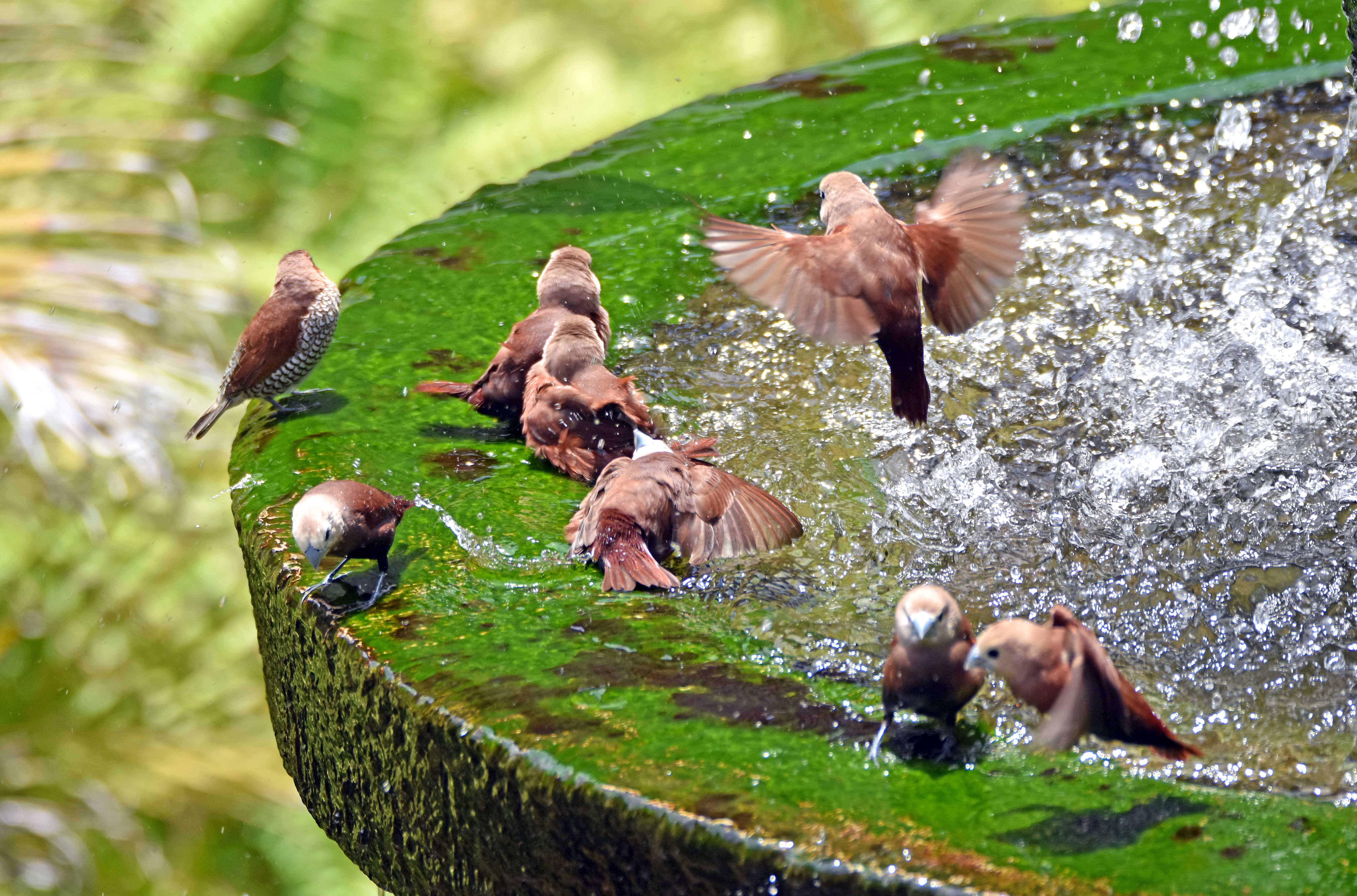 The White-headed munias flew down to the water fountain where they enjoyed a good bath, splashing and spreading their wings on the water.