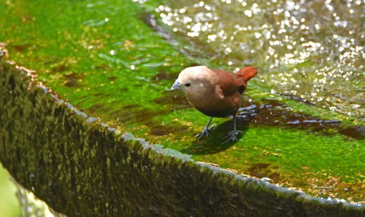 There was also one Scaly-breasted munia or spotted munia (Lonchura punctulata) at the fountain (below). There were a few other scaly-breasted munias lurking in the bushes, but this fountain was dominated by the white-headed ones. The juvenile White-headed munias have a more brown, or cinnamon-coloured head.