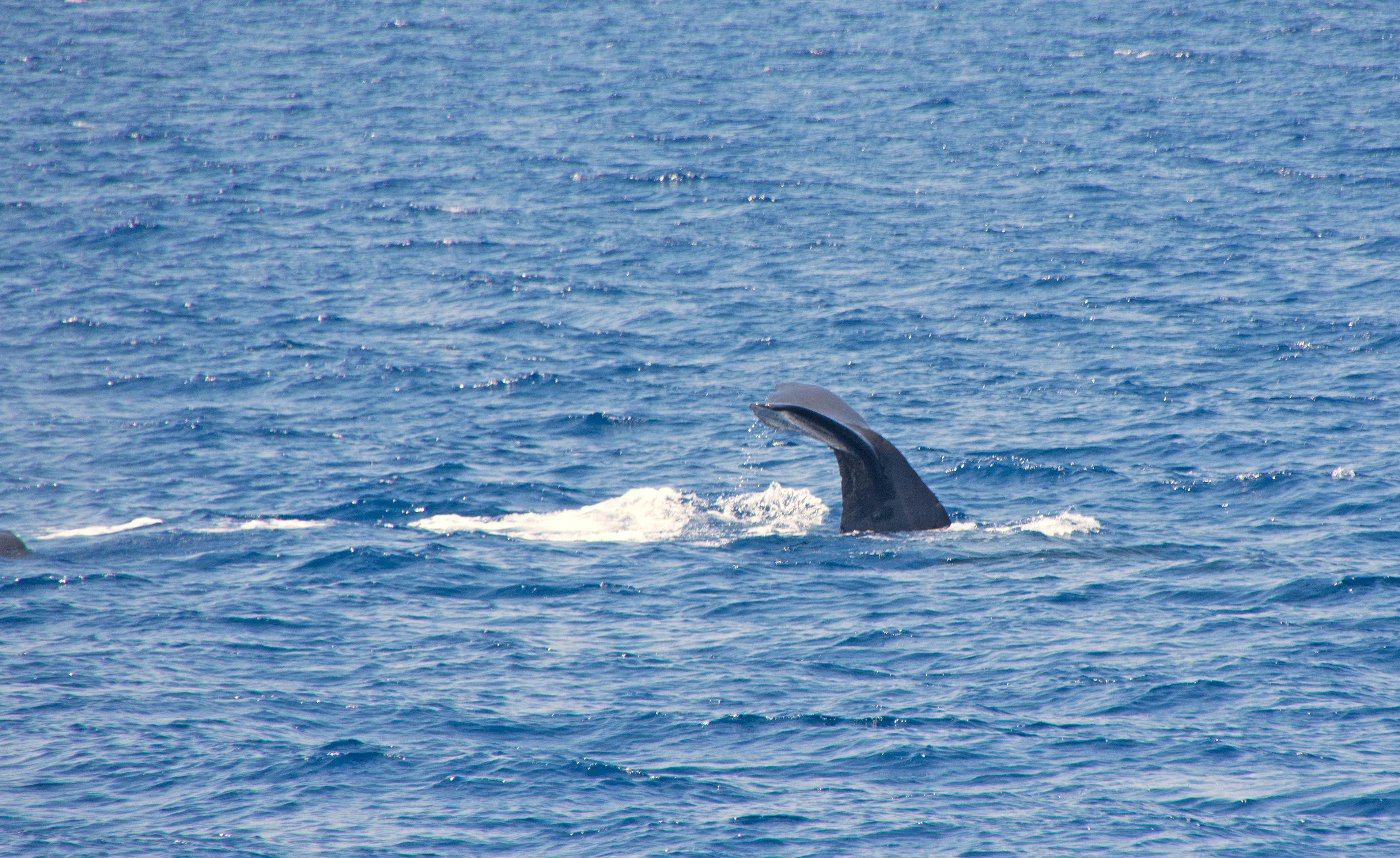 Before we could get much closer however, the whale ‘turned tail’ and started to dive. The average dive apparently lasts for about 35 minutes and is usually ‘only’ down to about 400 m, although they can stay down for an hour or so and reach depths over 1,000 m (1). I guess it depends on what they find down there and whether they start chasing some prey item. Or perhaps they get into protracted fights with giant squids who do not relish being consumed by this giant predator of the depths!