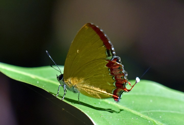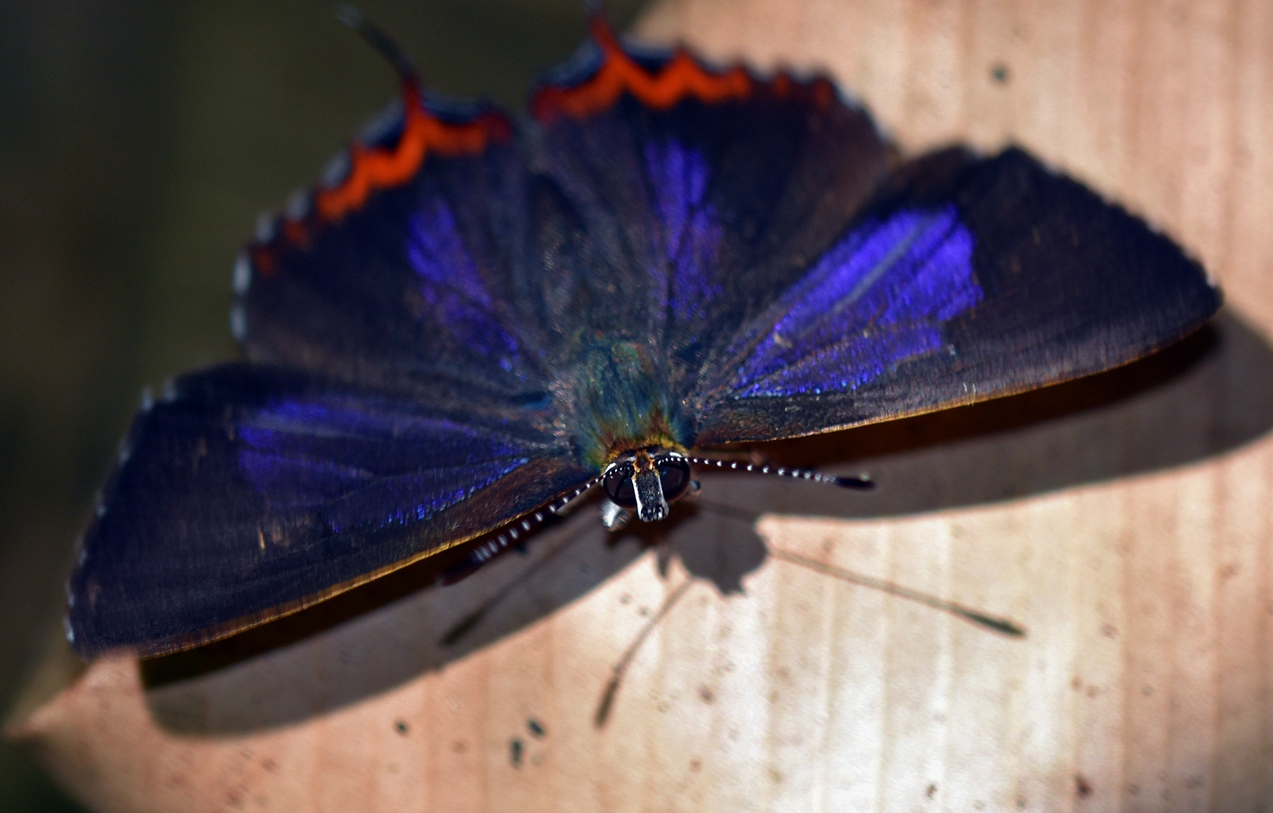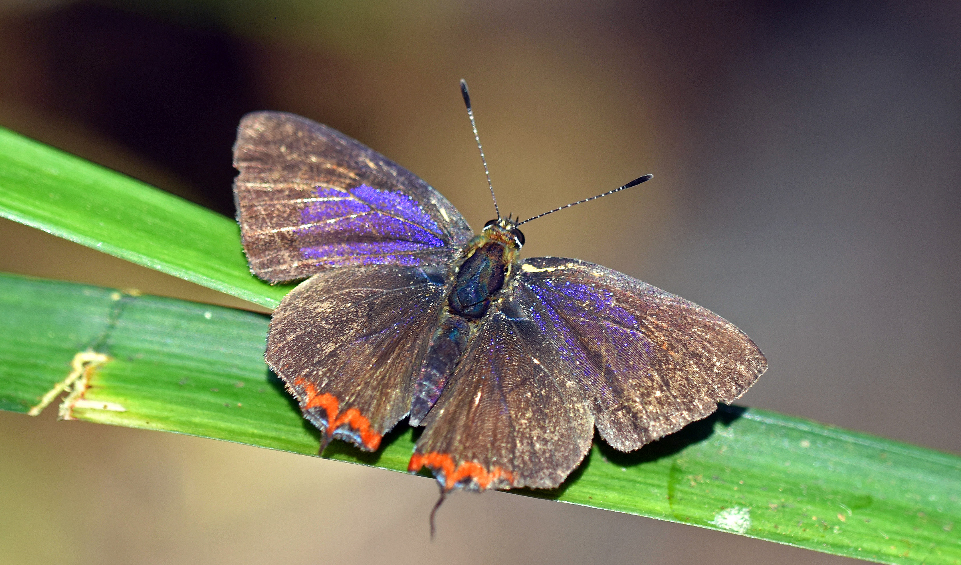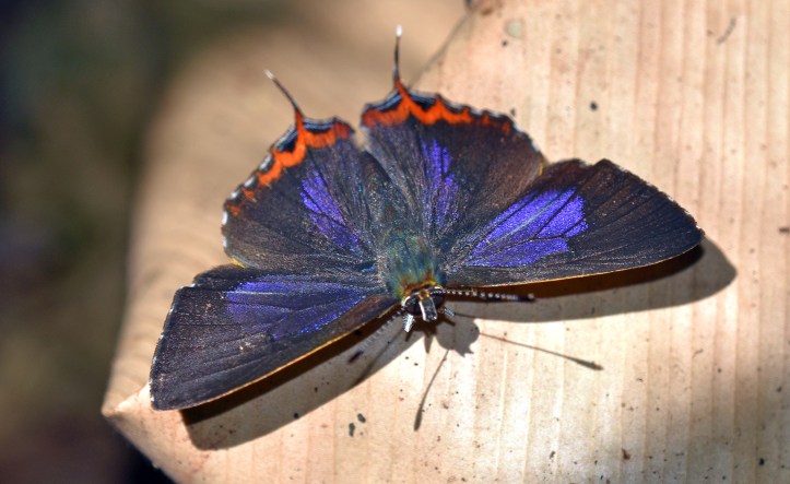 The brightly coloured, iridescent males rely on so-called, structural colouration (described below), which is used both in male-to-male interactions (competition), and in attracting females, via flickering or flashing their bright wings. The females are often dark brown and mostly lacking in these bright structural colours. They may – like female Purple Sapphires – have bright pigmentary colours (orange flashes in this case), but these are probably not secondary sexual characters, i.e. used in courtship and mating. I don’t have a picture of the female, but there are many examples on this website (1).