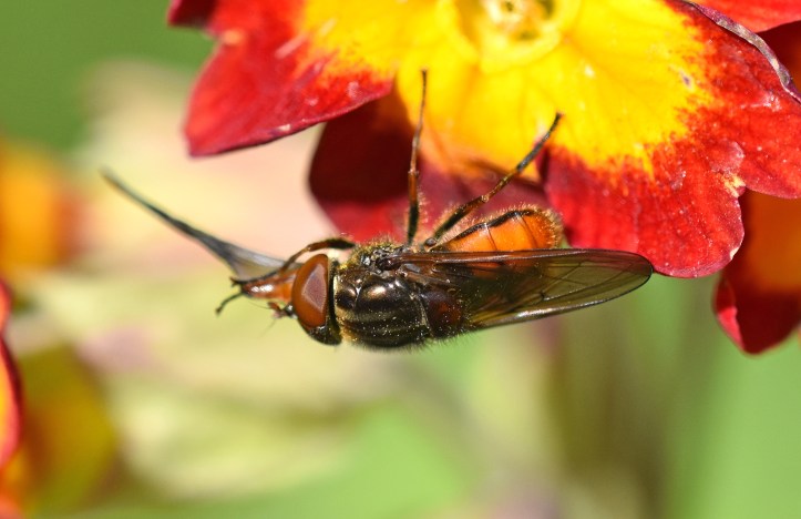 An organ, if that’s what it is, of this complexity and functional importance to the fly must be cleaned and looked after. The proboscis, when not in use, is folded up and stored within the snout, as can be seen in the very high magnification photograph in link number (3). I wonder if anybody has studied the proboscis in detail and worked out exactly how it is extended and folded up? The following photograph is not very good, but is the best one I have of the extended proboscis in side view. The proboscis is clearly a complex structure and one that must have evolved to allow the fly to access deep nectar sources.