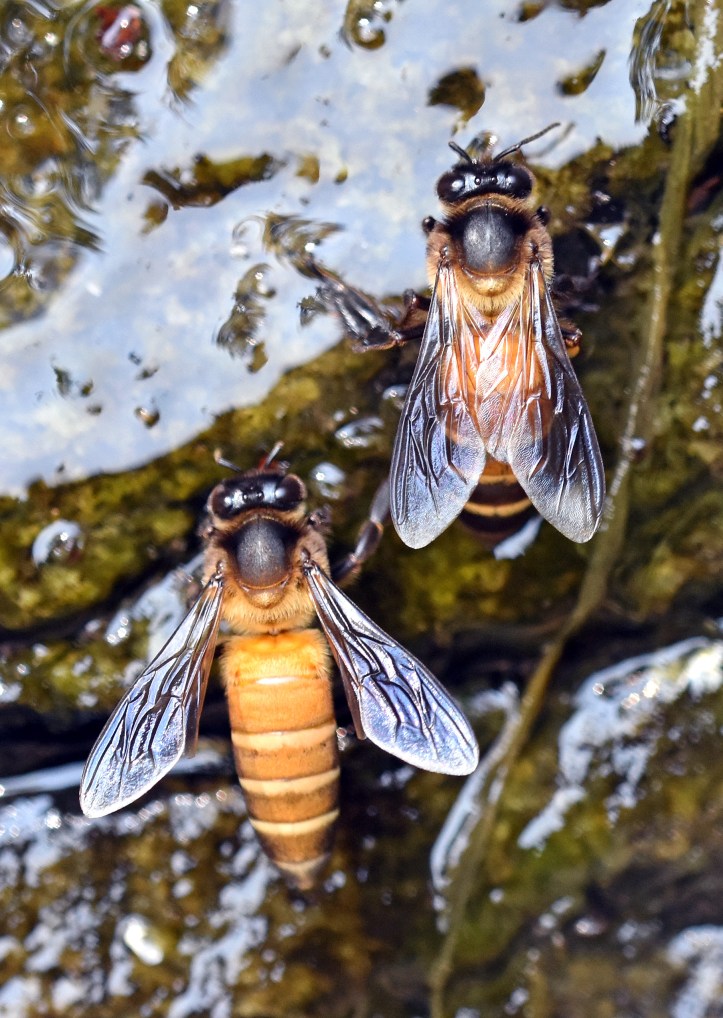 During hot weather, they are often seen on or near wet places collecting water. I came across these at Mon Tha Than waterfall, halfway up Doi Sutep mountain near Chiang Mai, northern Thailand. It was particularly hot with temperatures approaching 40 deg C at the foot of the mountain. These worker bees were presumably collecting water to take back to the colony.