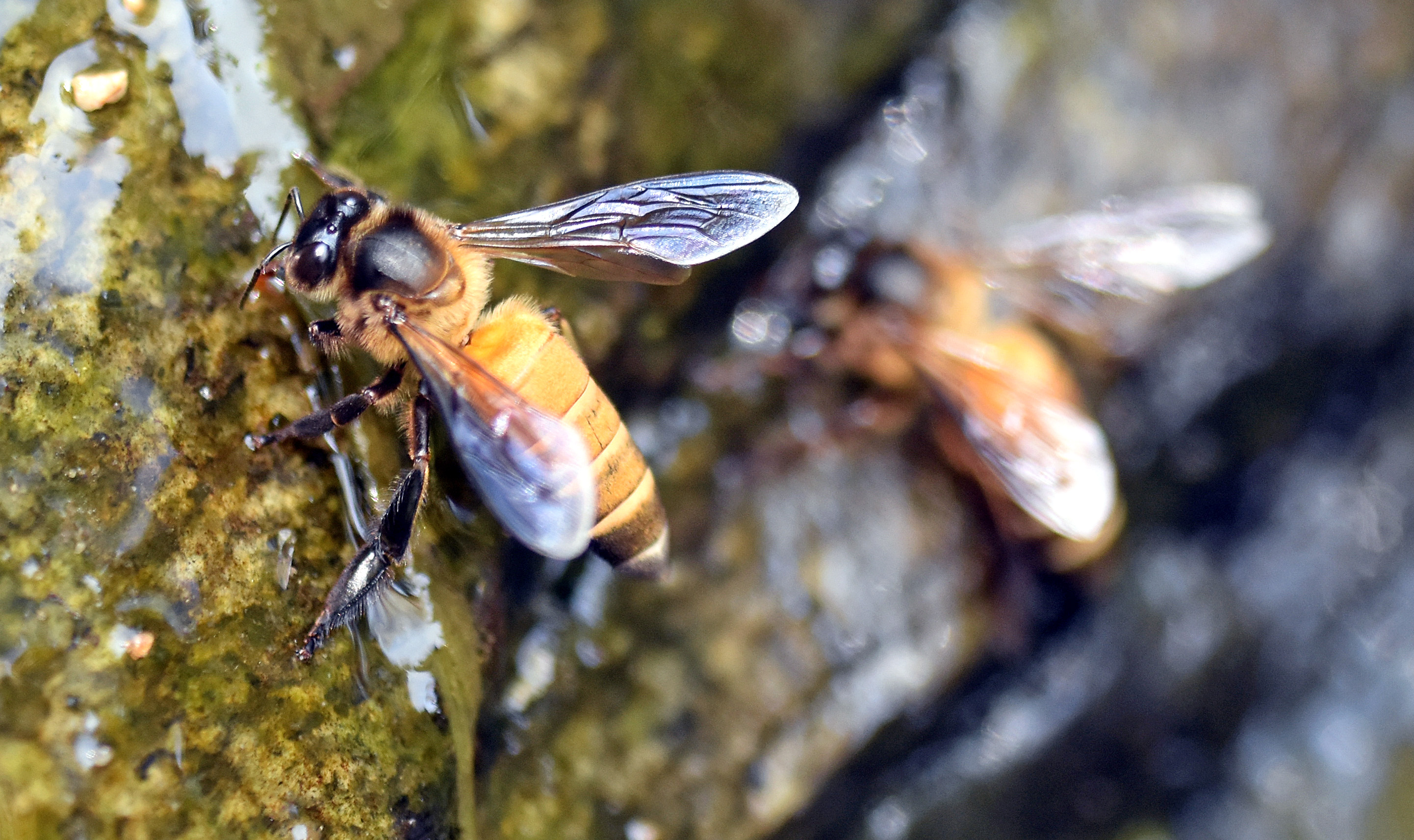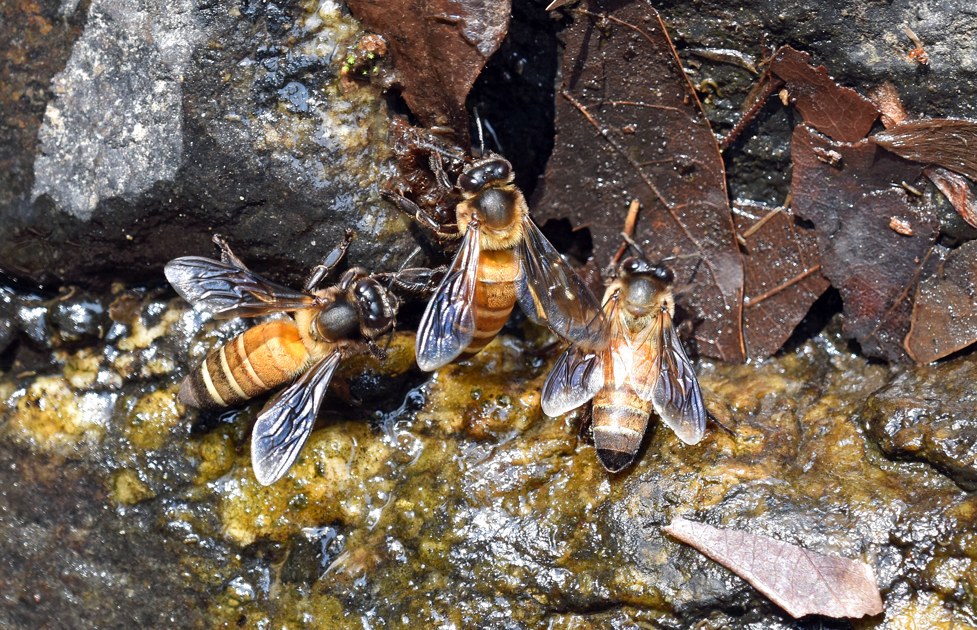 During hot weather, they are often seen on or near wet places collecting water. I came across these at Mon Tha Than waterfall, halfway up Doi Sutep mountain near Chiang Mai, northern Thailand. It was particularly hot with temperatures approaching 40 deg C at the foot of the mountain. These worker bees were presumably collecting water to take back to the colony.
