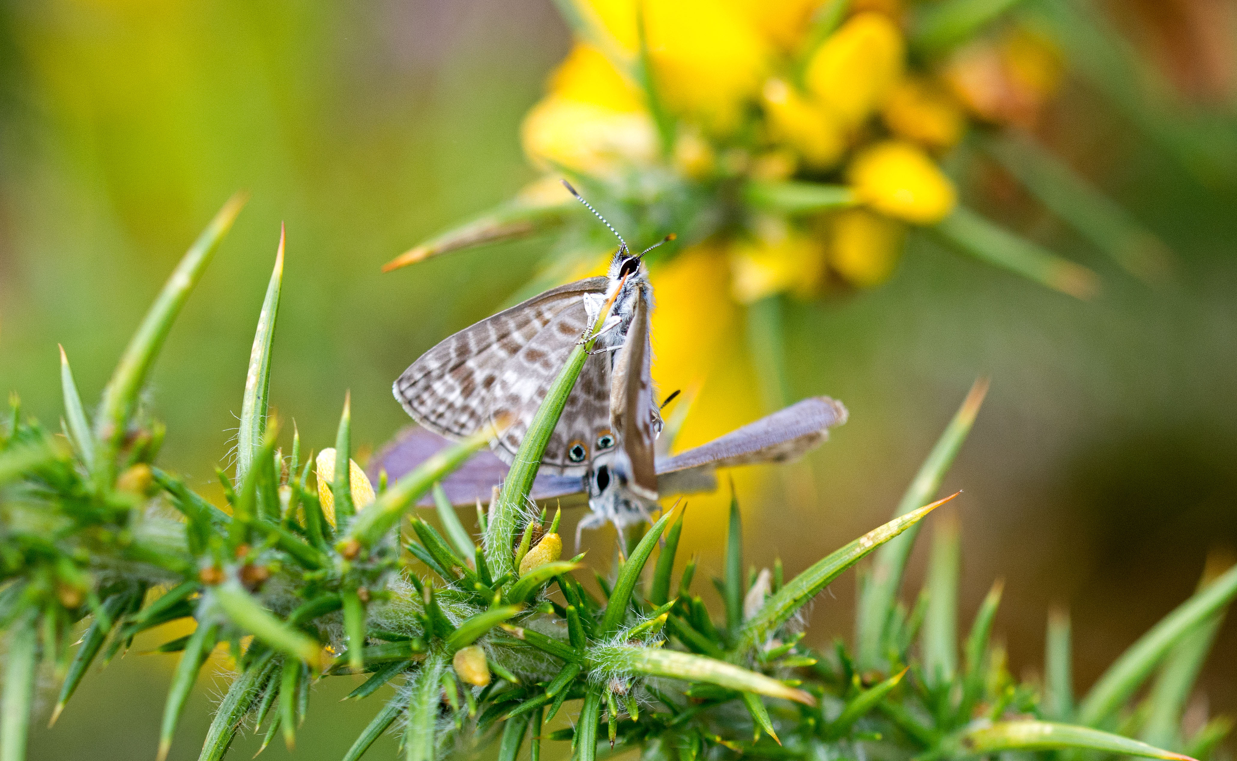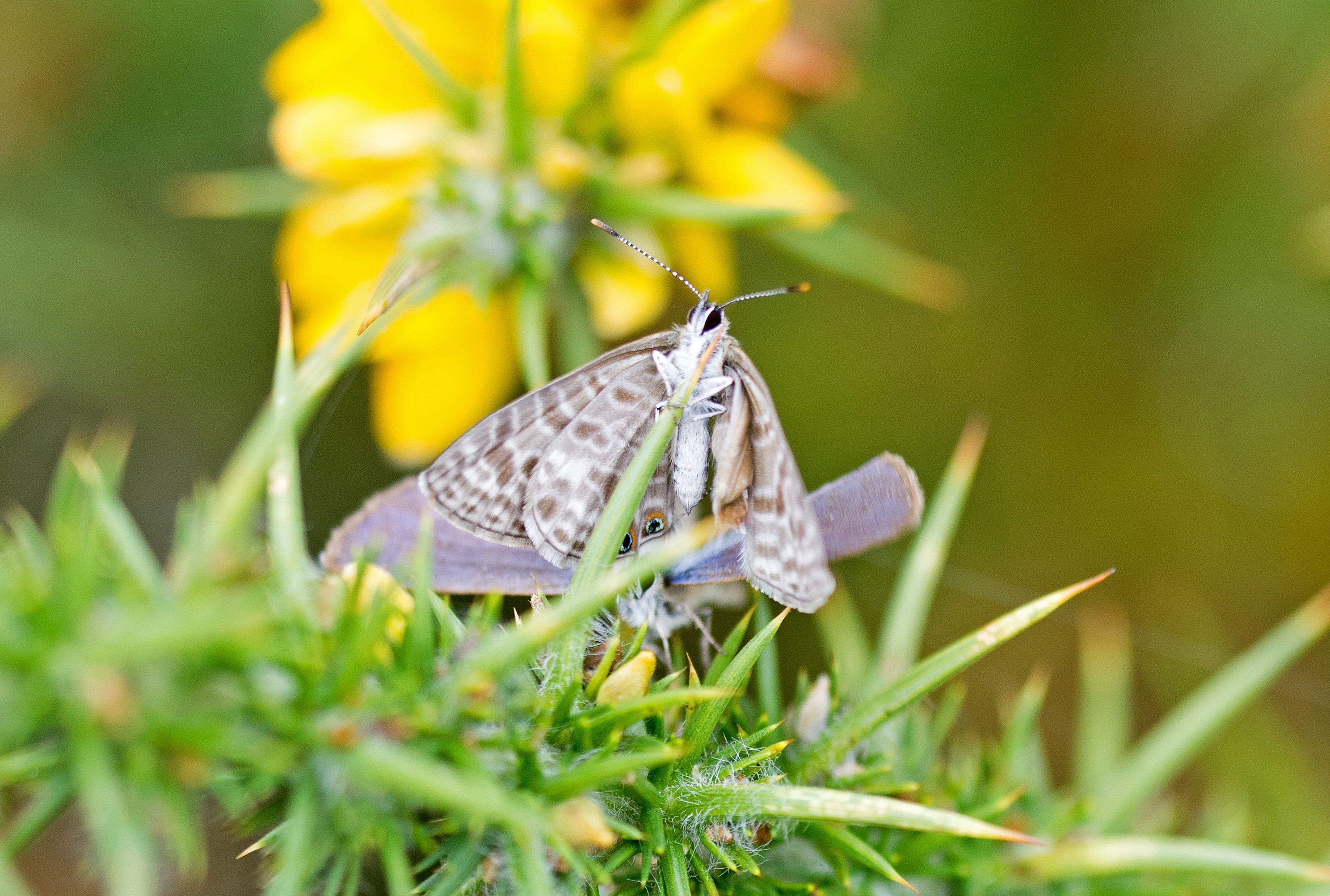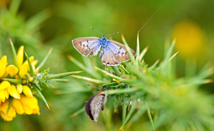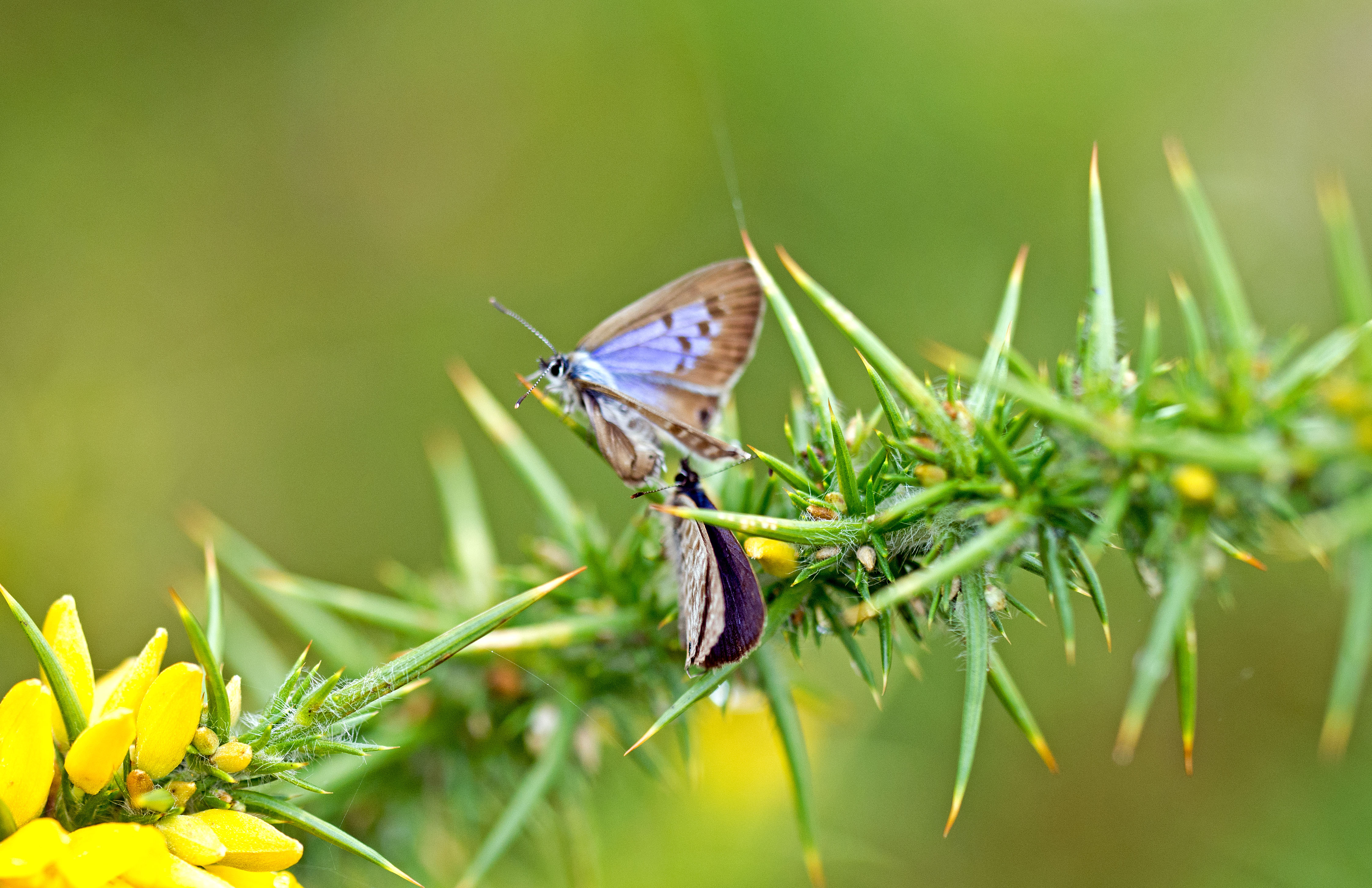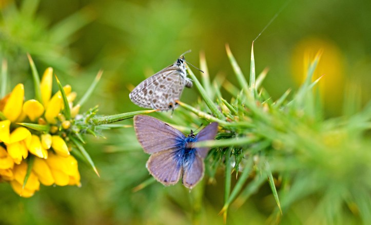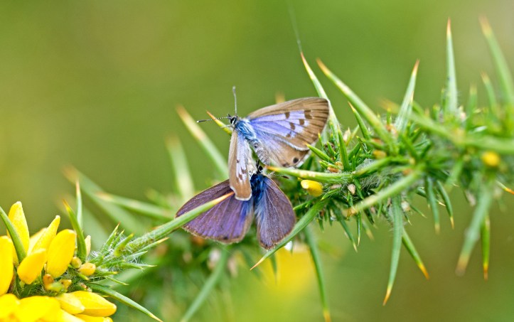In the next two shots, the female appears to be moving away from the male, inching up towards the point of the gorse leaf. The male’s wings are closed in the second photo (below), showing that he is fluttering.