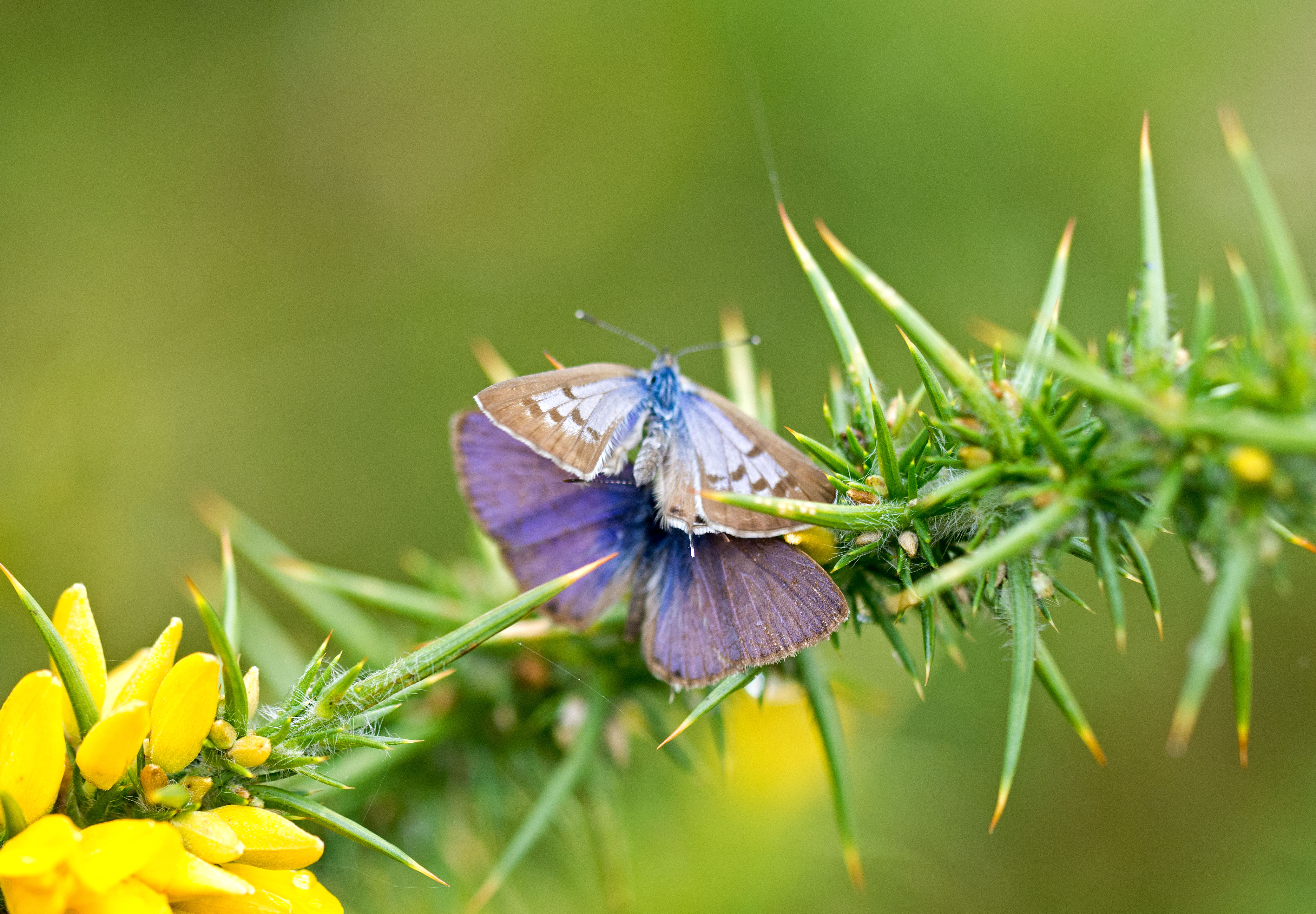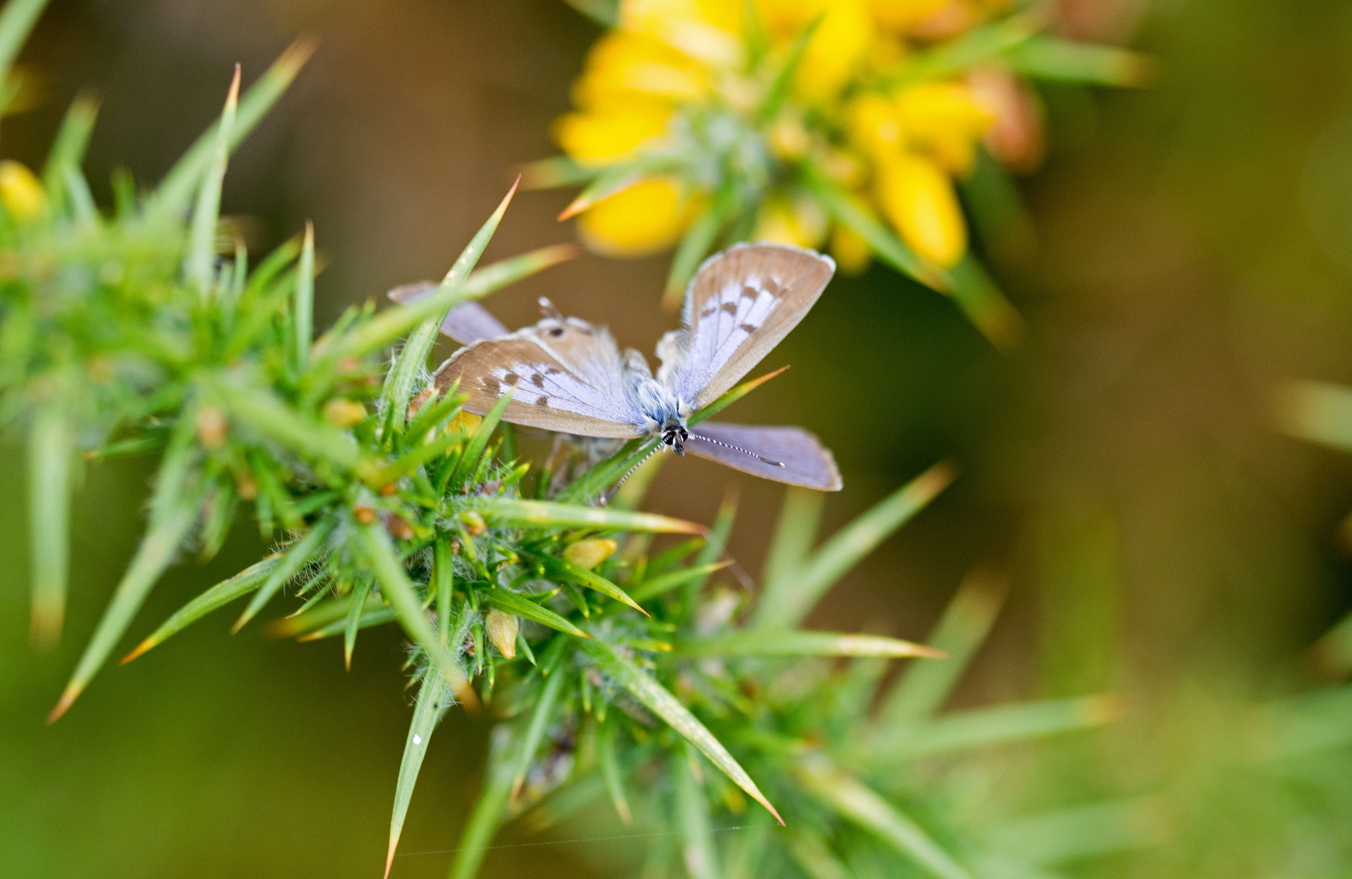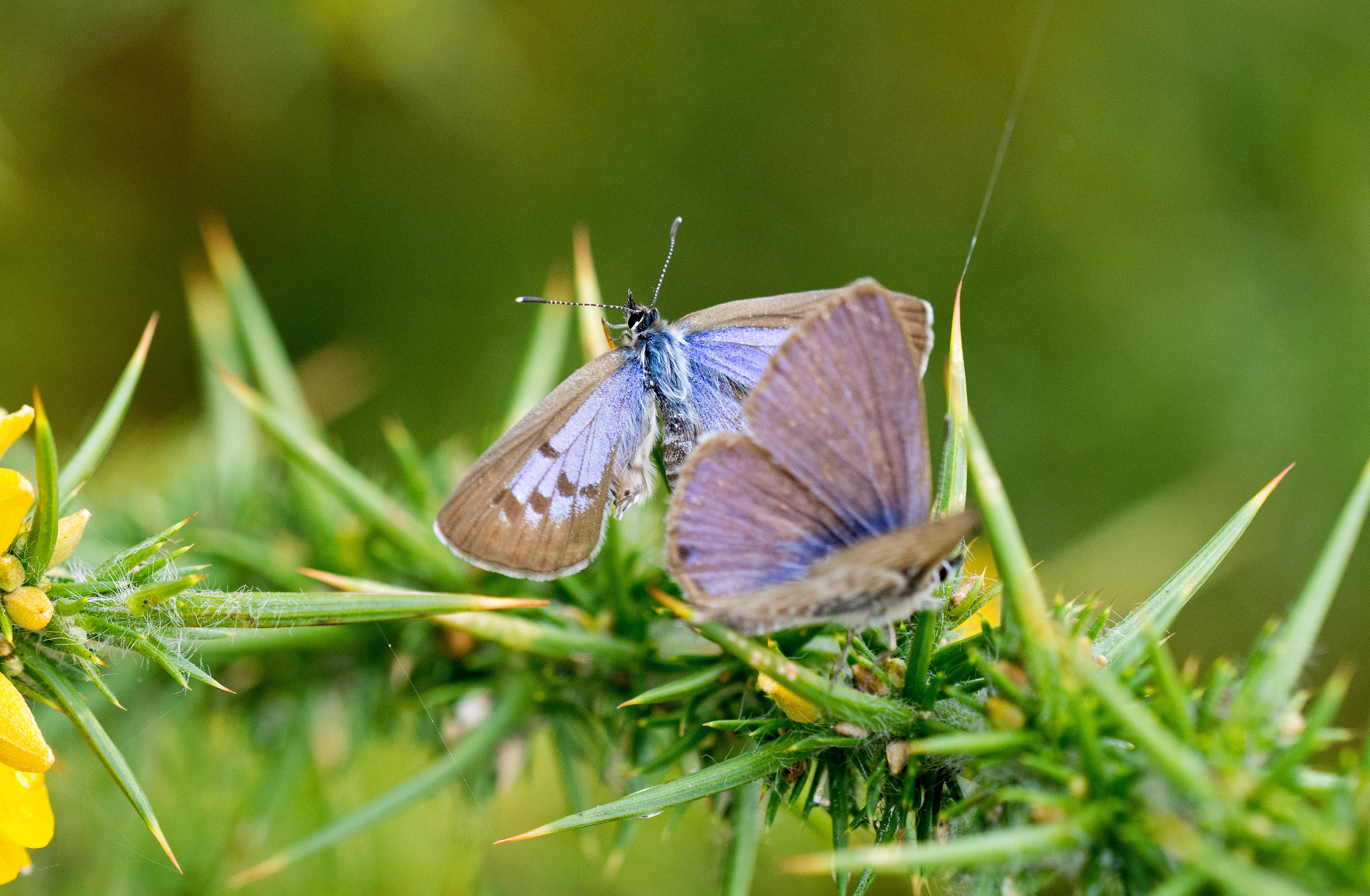In the next two shots, the female appears to be moving away from the male, inching up towards the point of the gorse leaf. The male’s wings are closed in the second photo (below), showing that he is fluttering.