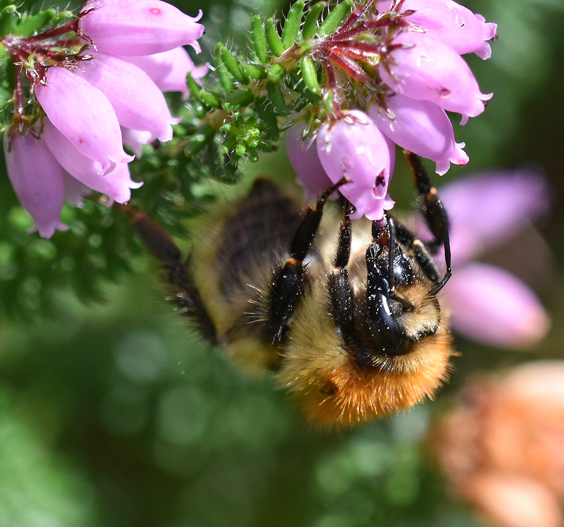 The length of time a bumble-bee spends at a given flower, depends on the amount of nectar available; rather than the amount of pollen. Bees are not the only insects to get covered in pollen of course. I came across some invasive Asian hornets feeding (or gathering pollen?) in among the heather in Spain, and they were heavily dusted with pollen (below). How efficient they are at grooming, and what they do with it, I have no idea (feed it to their offspring perhaps?).