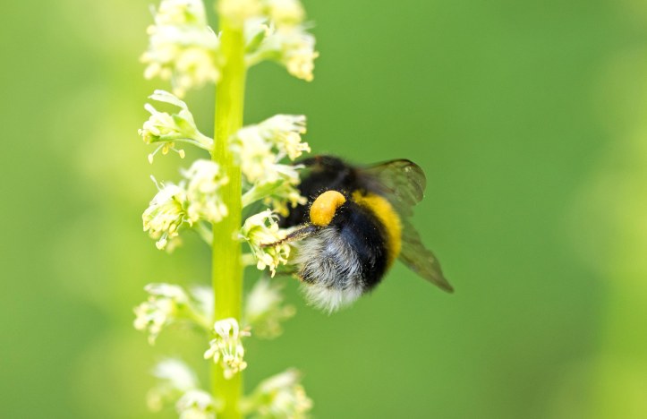 So it may be that bumblebees are prepared to tolerate a slight smattering of pollen without feeling the need to groom themselves? It is certainly in the plants interests that they do not keep their bodies completely free of pollen. There may also be a balance to be had between spending time on nectaring and spending time grooming. Although, if they can do their grooming on the wing, between flower visitations, they save themselves a lot more time for feeding. Remarkably, some plants – such as Lupinus (lupin) flowers – control the amount of pollen that can be removed during a single visit by a bee; presumably to avoid having it all scooped up into pollen baskets! Pollen collected in this way is effectively ‘lost’ as far as the plant is concerned because it will never reach a stigma and fertilise another flower.