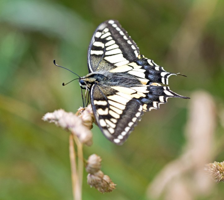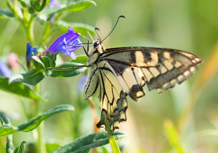 My final visit to the site, came two weeks later on 28 September. The swallowtail butterflies I came across then were all very worn, and were in a different location. They were busy nectaring on Viper’s bugloss flowers slightly lower down from the hill-topping site. They were definitely the last of the season. Perhaps they were females? The sexes are similar, so I don’t think it is possible to tell them apart from photographs.