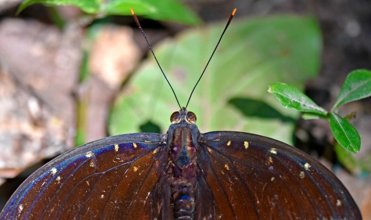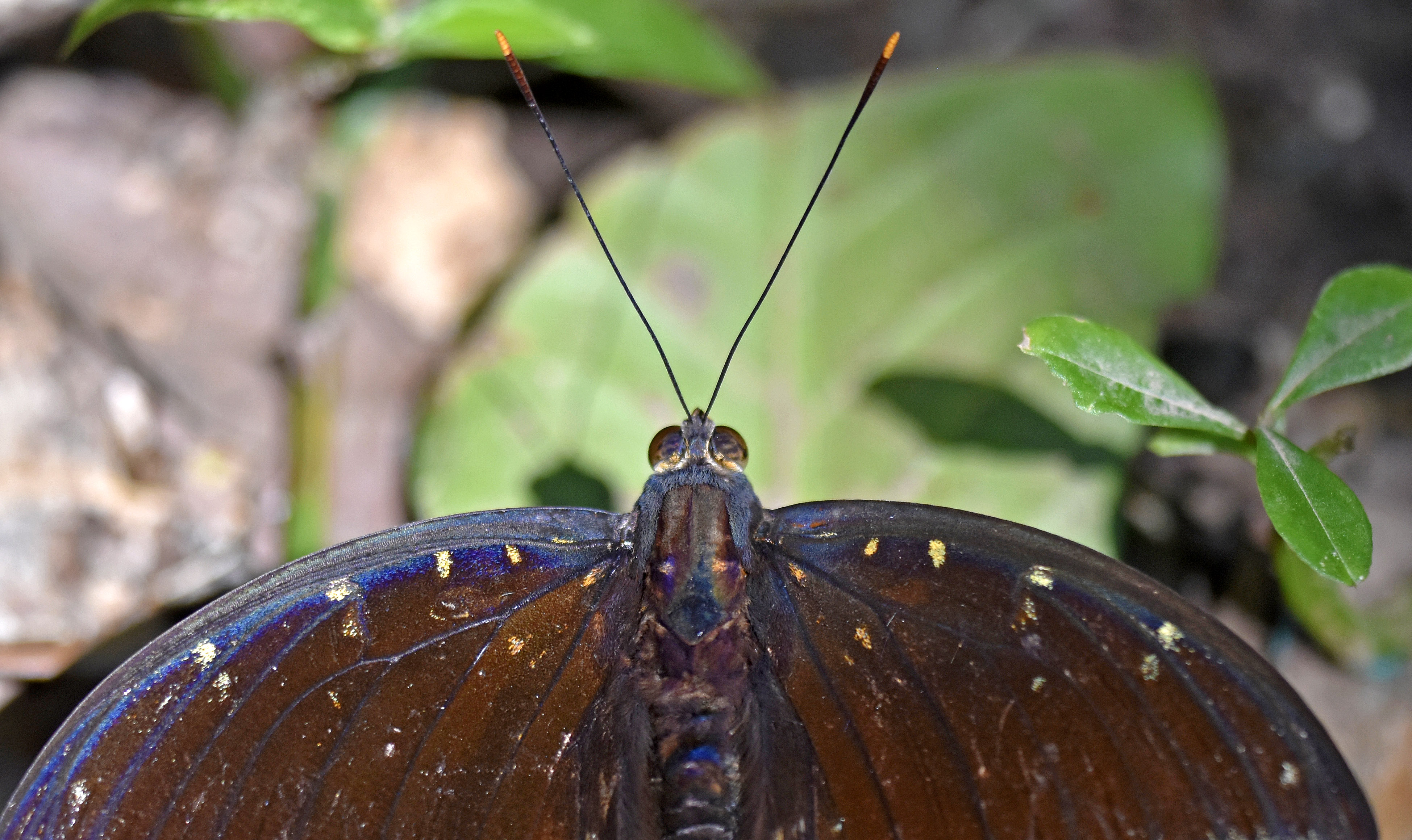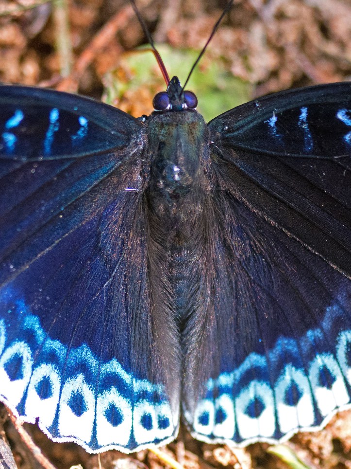 The male Archdukes on the other hand are rather different in appearance (above). I don’t think that they have quite given up on camouflage – with their largely brown wings and a few yellow spots – but they also have other priorities, and that means looking smart and dapper! They need to attract the ladies, and their bright blue and white scales along the wing margins no doubt have something to do with this. Perhaps they look good in UV. Butterflies have sophisticated colour vision, with a very broad range of light perception – in some species ranging from ultraviolet through to red – amongst the broadest of all animals and better than us! Here (below) is a close up of the leading edge of the forewing of a male Archduke, showing nice blue iridescent wing scales.