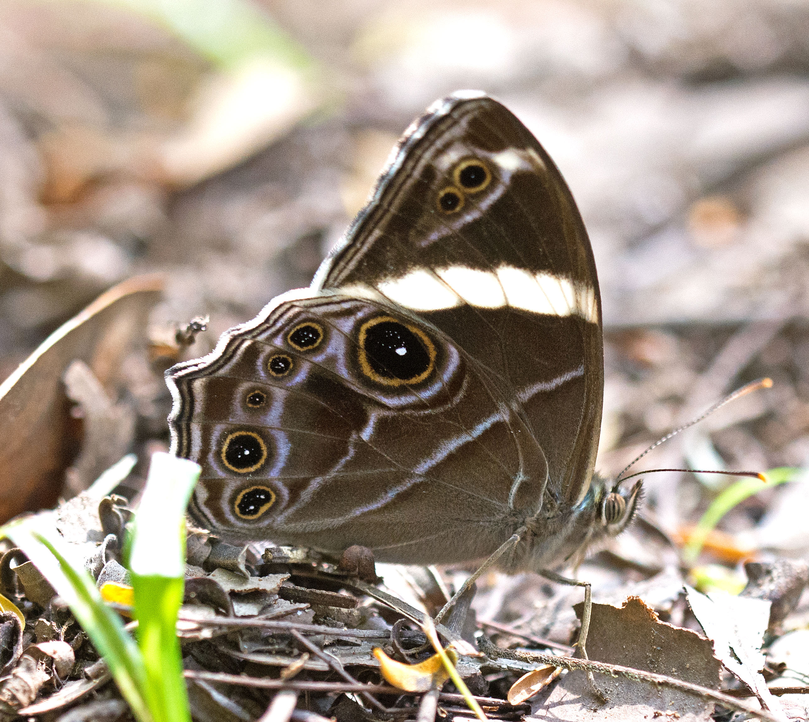 A species with particularly attractive eyespots is the Banded Treebrown (Lethe confusa), see below. A nice combination of cryptic brown colouration together with predator-deflecting eyespots and a broad white band, perhaps some form of disruptive camouflage?