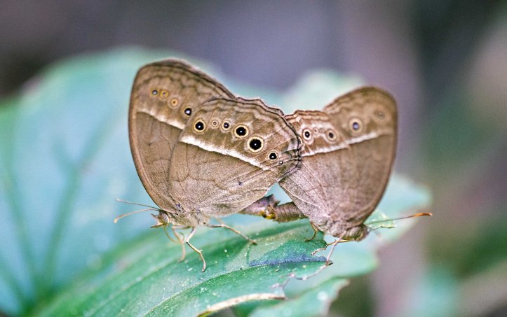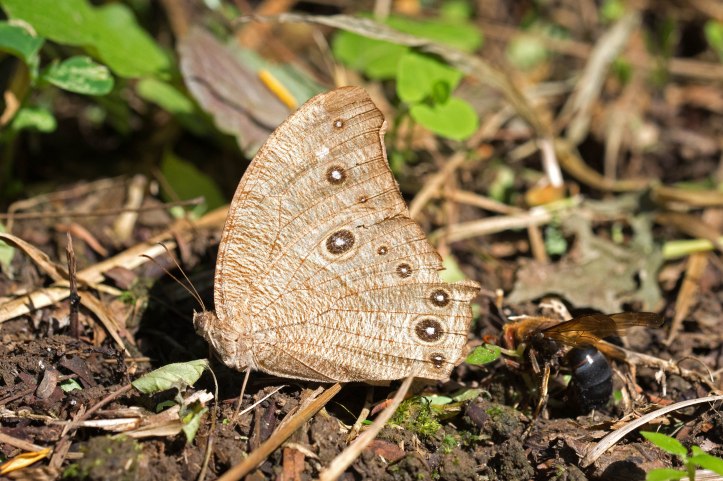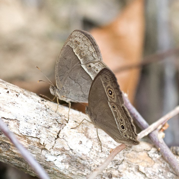 There were lots of interactions going on in the wood; pairs of butterflies engaging in spiraling flights, seen in so many species all over the world, but devilishly difficult to photograph! These circling flights might be little battles – ‘wars of attrition’ – between two males, perhaps a territorial dispute over ownership of a sunspot territory. Strangely enough, the resident butterfly almost invariable wins. Holding on to a territory in this way greatly increases a male’s chances of locating a mate and the residents are very tenacious in hanging on to their tiny piece of real estate! Or they might be courtship flights. A male and a female dancing together in the air to see whether they like each other enough to settle down on a leaf and start the serious business of courtship! I came across one such pair evaluating each other in this way (below). Oddly enough, one was a wet season form (with large ventral eyespots) and the other was a dry season form (with small, reduced ventral eyespots). Perhaps it was on the cusp of changing seasons, and both forms were around.