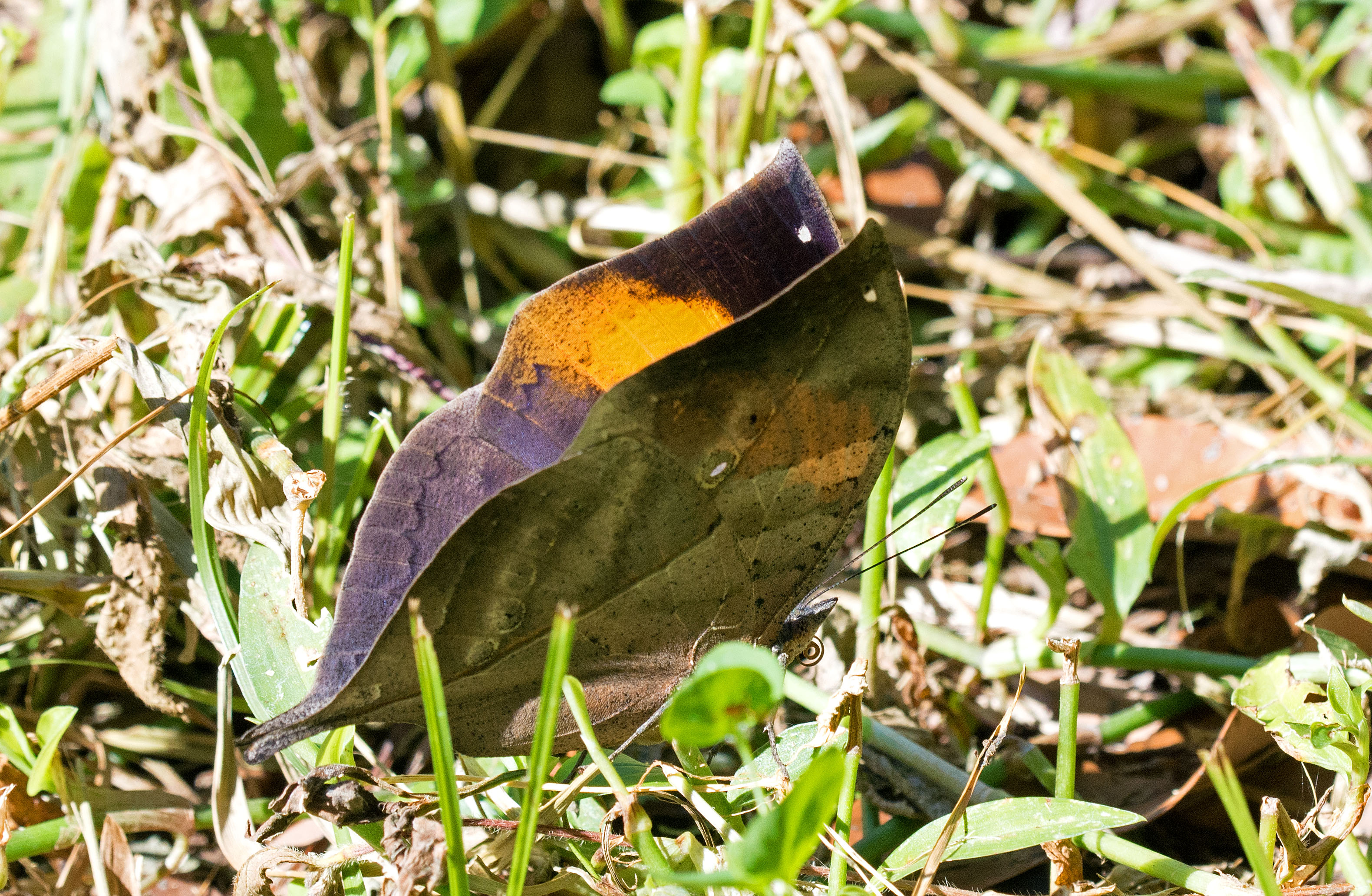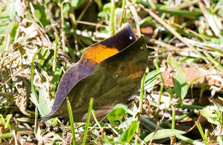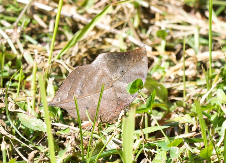Another species, very well adapted to blending in against a background of dry leaves on the forest floor, is the Indian Leaf butterfly (Kallima inachus). Funnily enough, the one I managed to get close to – but not close enough! – was enjoying a little sunshine on the grass, not sitting amongst the dry leaves which its ancestors had spent millions of years evolving a perfect cryptic resemblance to!