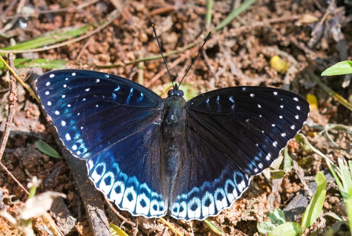 There were lots of other ‘small brown jobs’ – a term usually used for birds! But it might be best to finish with one of the most beautiful butterflies down in the wood: the Popinjay (Stibochiona nicea subucula). Both sexes are strikingly attractive in this species, but the male is a real dandy with his lovely blue and white against a velvety black background. Whoever named this butterfly – George Robert Gray FRS (1808 – 1872) – certainly chose an appropriate name!