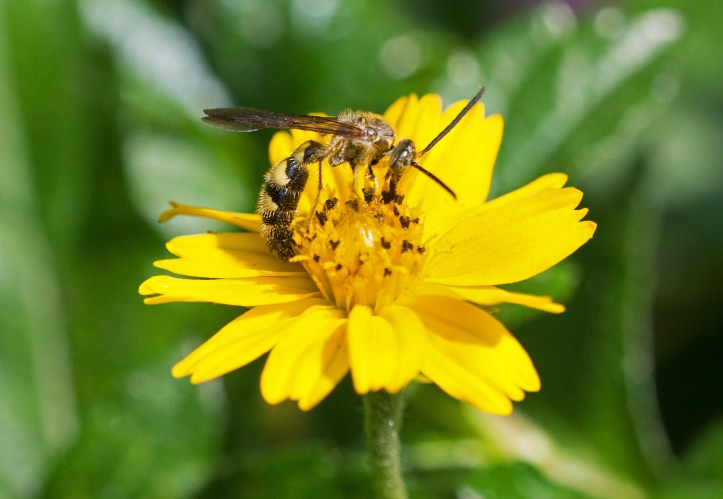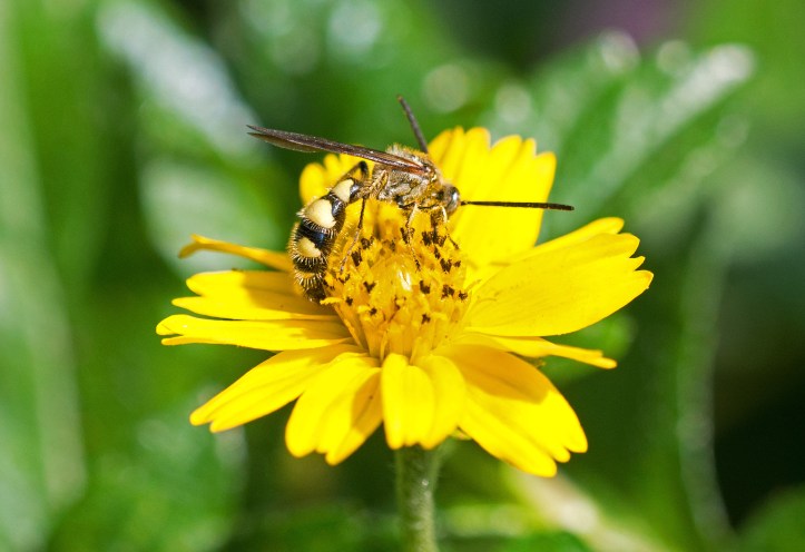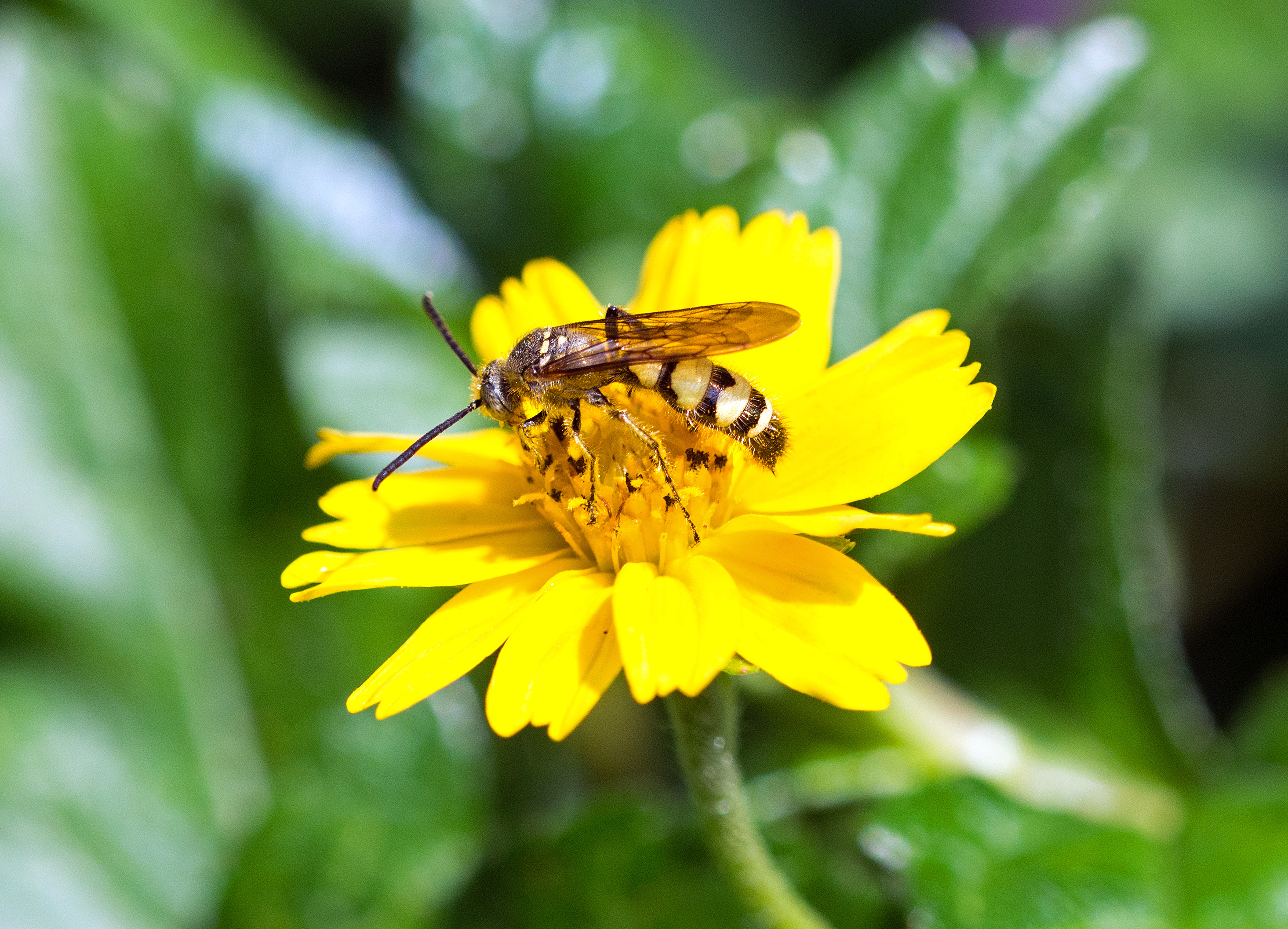 It is interesting to observe how the wasp is standing on the flower with four legs (below); but the back pair of legs are held aloft, out of the way. Sometimes an insect only needs 4/6 of its legs!