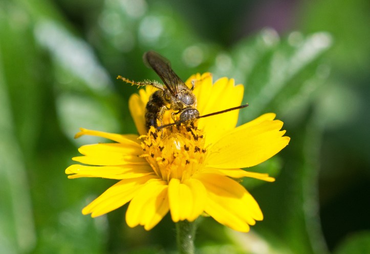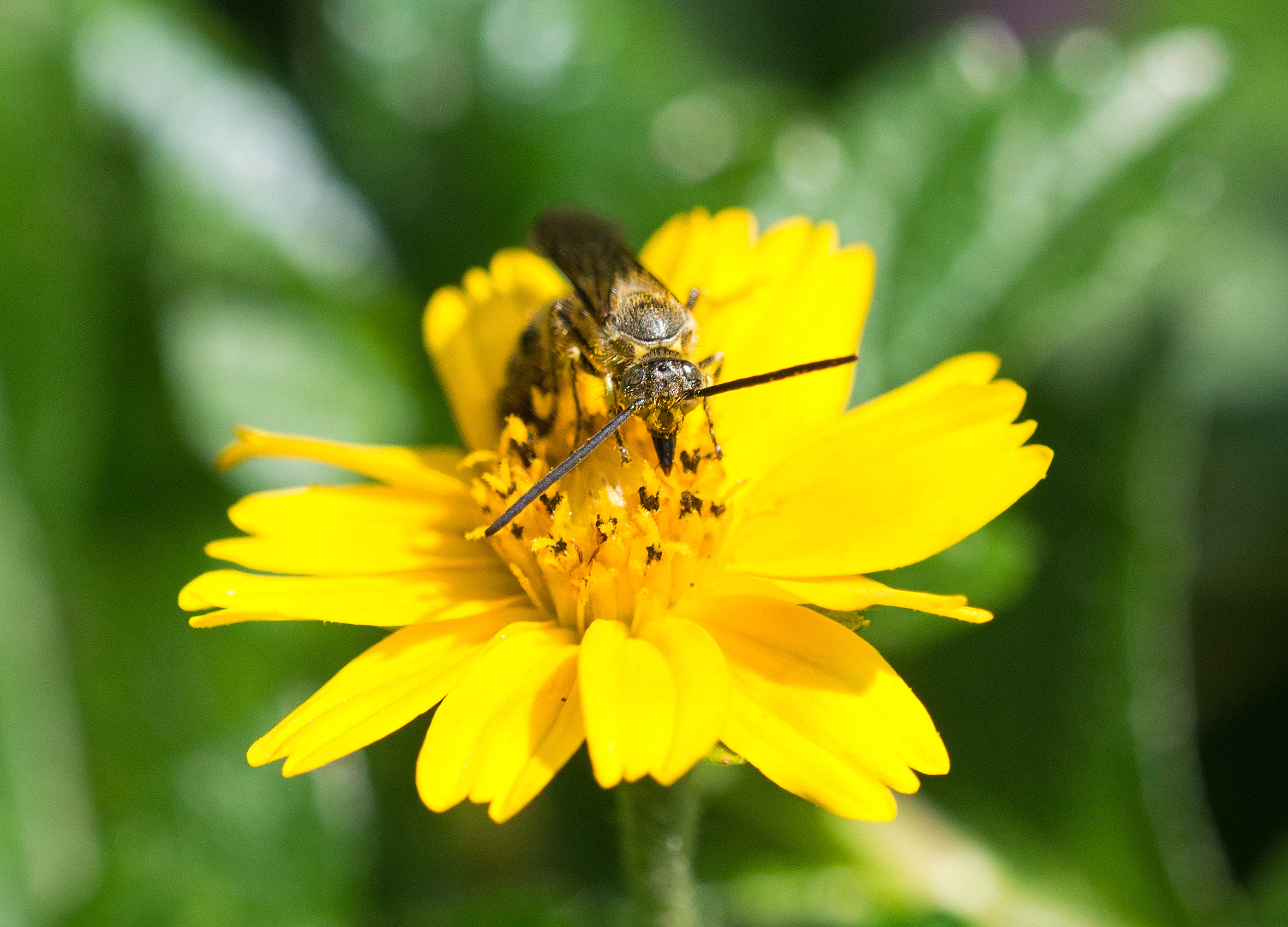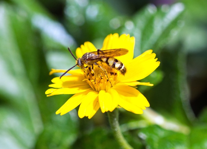 You would not know, just by looking at this wasp – a Hairy Flower wasp – that it lays its eggs on beetle larvae living underground. Although the adults feed on nectar, the larvae feed on – are parasites of – the grubs of scarab beetles (Scarabaeidae). In some situations – because beetle larvae can be damaging pests – scoliid wasps can be useful biocontrol agents. The males are supposed to have longer antennae than the females, maybe this one – with its large black antennae – was a male? (See below). The mouth-parts are funnel-shaped..