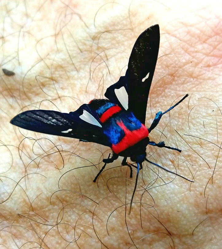 Many Amata species are beautifully coloured, with shiny blue, red, yellow and black colours. There are however, other similarly brightly coloured day-flying moths – called window-winged Moths (Family Thyrididae) – which also have strong (e.g. black and red) warning colours and coloured wing patches. I had the pleasure of observing one of these at close quarters, when it landed on my hand to partake of some sweat! I somehow managed to take these photographs with my mobile phone!