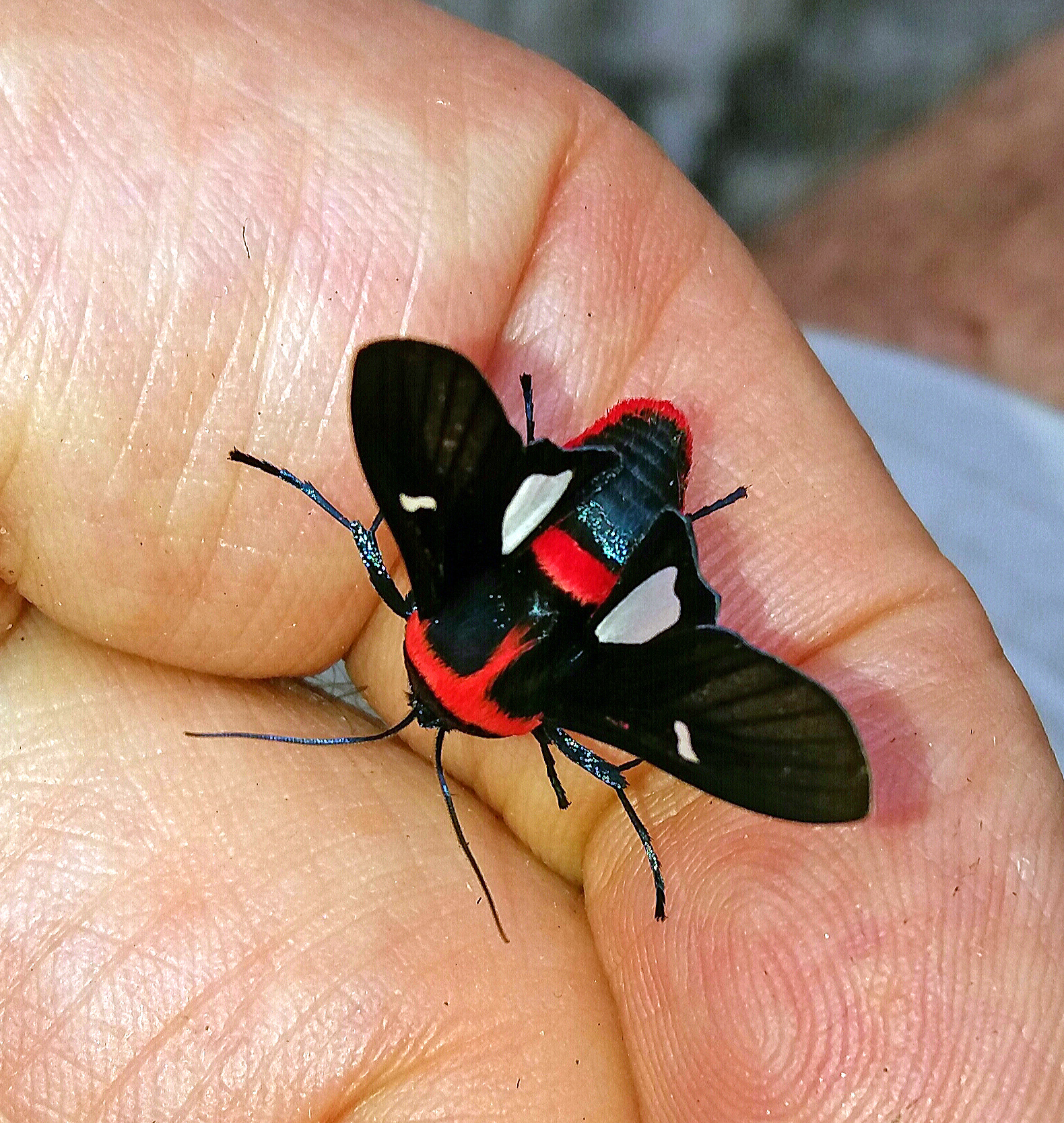 Many Amata species are beautifully coloured, with shiny blue, red, yellow and black colours. There are however, other similarly brightly coloured day-flying moths – called window-winged Moths (Family Thyrididae) – which also have strong (e.g. black and red) warning colours and coloured wing patches. I had the pleasure of observing one of these at close quarters, when it landed on my hand to partake of some sweat! I somehow managed to take these photographs with my mobile phone!