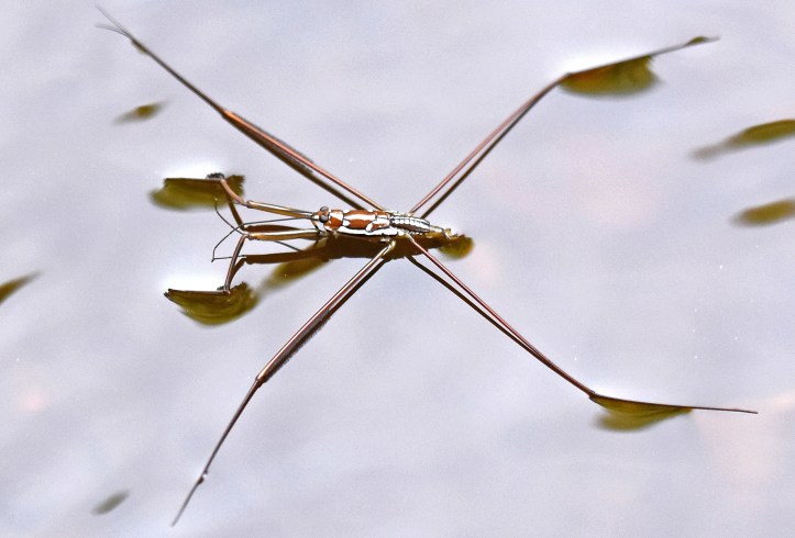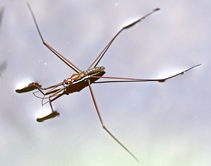 Water striders can stand on the water and even jump off the surface, because of their low body mass and super-hydrophobic (i.e. non-wettable) legs (2). Their legs and ‘feet’ (tarsi) are covered in large numbers of tiny hairs called micro-setae –  with special microscopic grooves – which allow them to use the surface-tension of the water to stay afloat (3). Amazingly they are able to ‘survive on water even if they are being bombarded by raindrops, when they bounce to avoid being drowned’ (3).