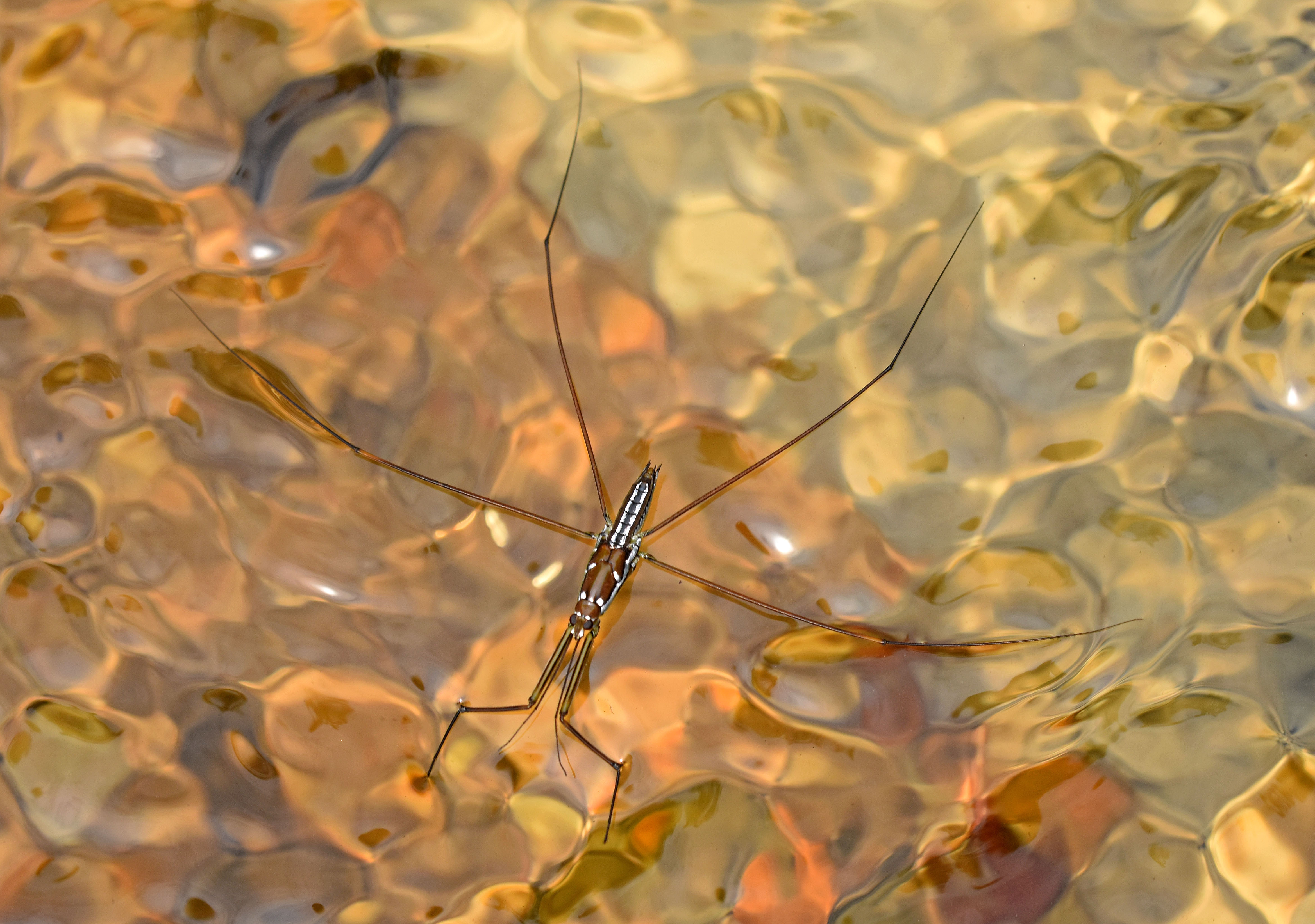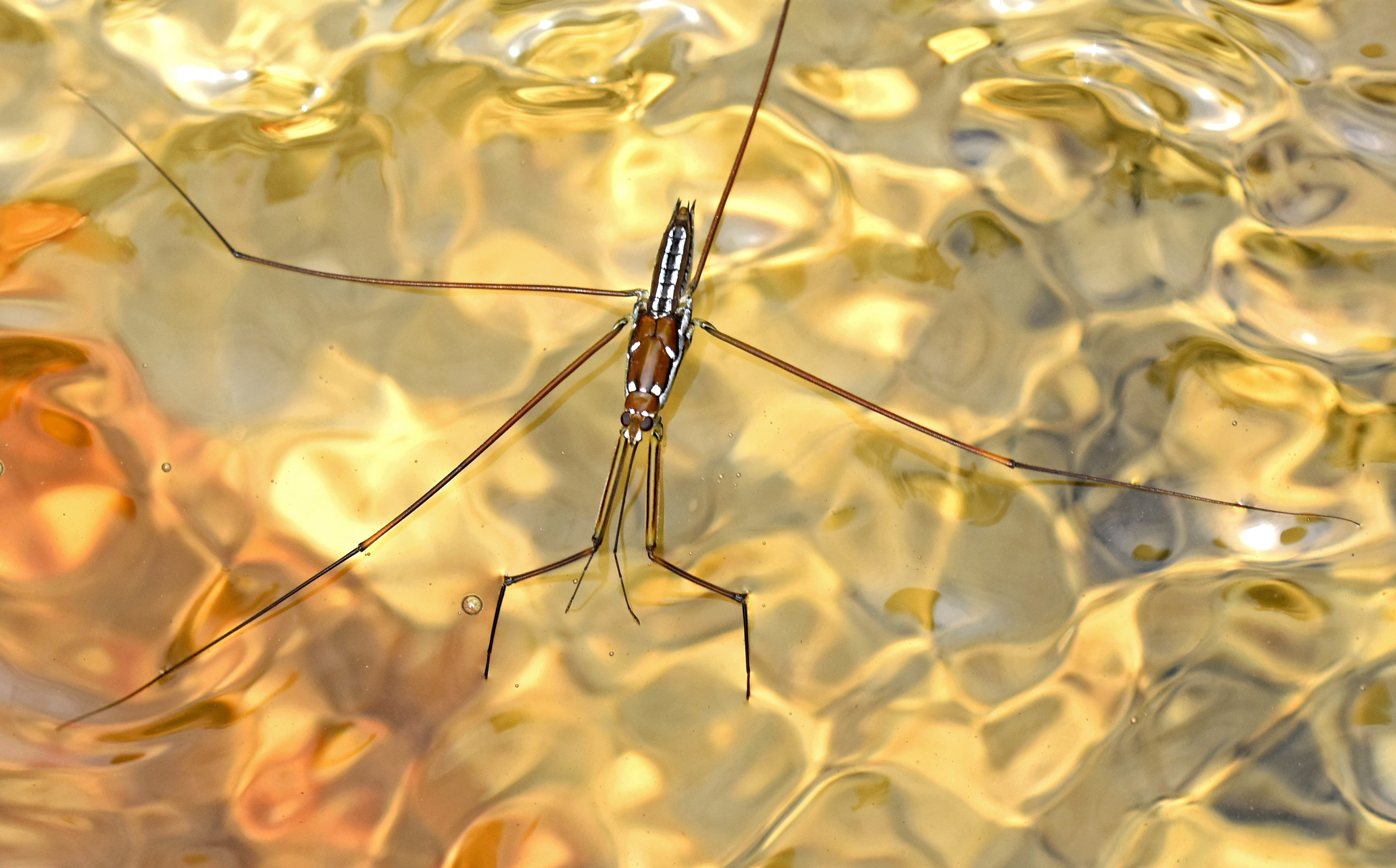 Water striders can stand on the water and even jump off the surface, because of their low body mass and super-hydrophobic (i.e. non-wettable) legs (2). Their legs and ‘feet’ (tarsi) are covered in large numbers of tiny hairs called micro-setae –  with special microscopic grooves – which allow them to use the surface-tension of the water to stay afloat (3). Amazingly they are able to ‘survive on water even if they are being bombarded by raindrops, when they bounce to avoid being drowned’ (3).