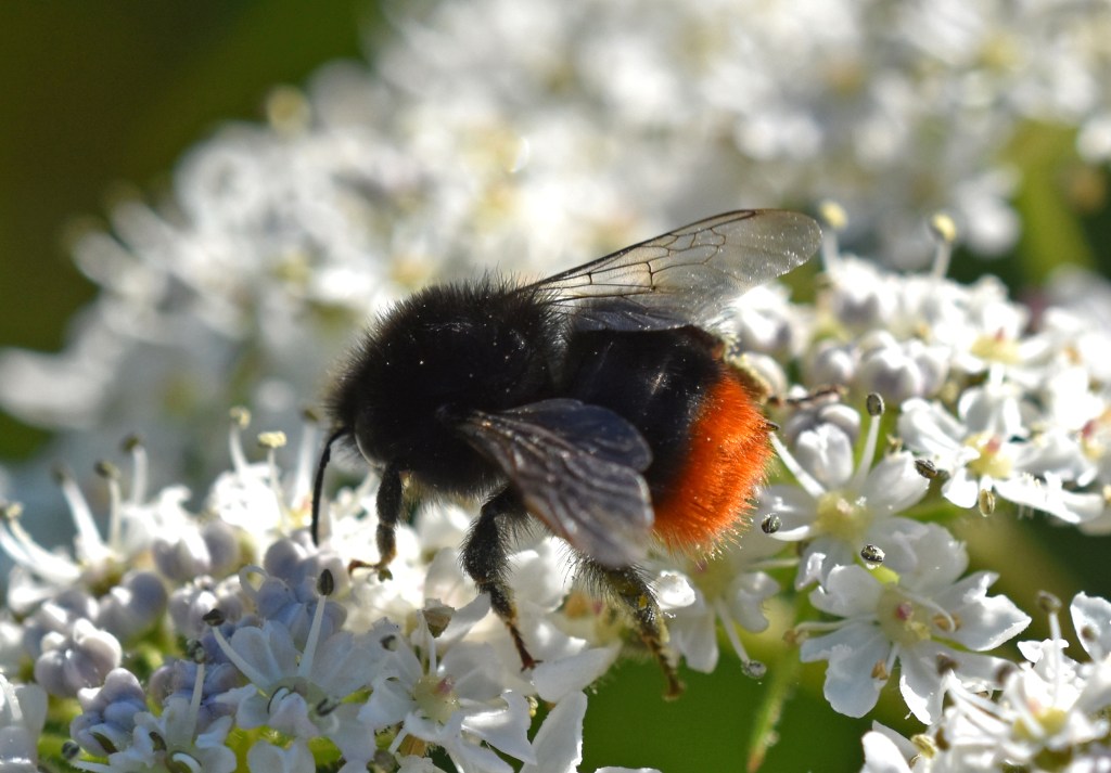The next morph, Volucella bombylans var. bombylans, has an orange-red tail (below), and mimics the Red-tailed Bumblebee, Bombus lapidarius (second below).