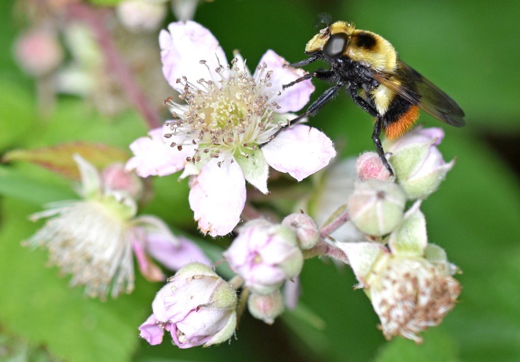 Volucella bombylans var. haemorrhoidalis on dog rose. Galicia, Spain. Photo by Raymond JC Cannon