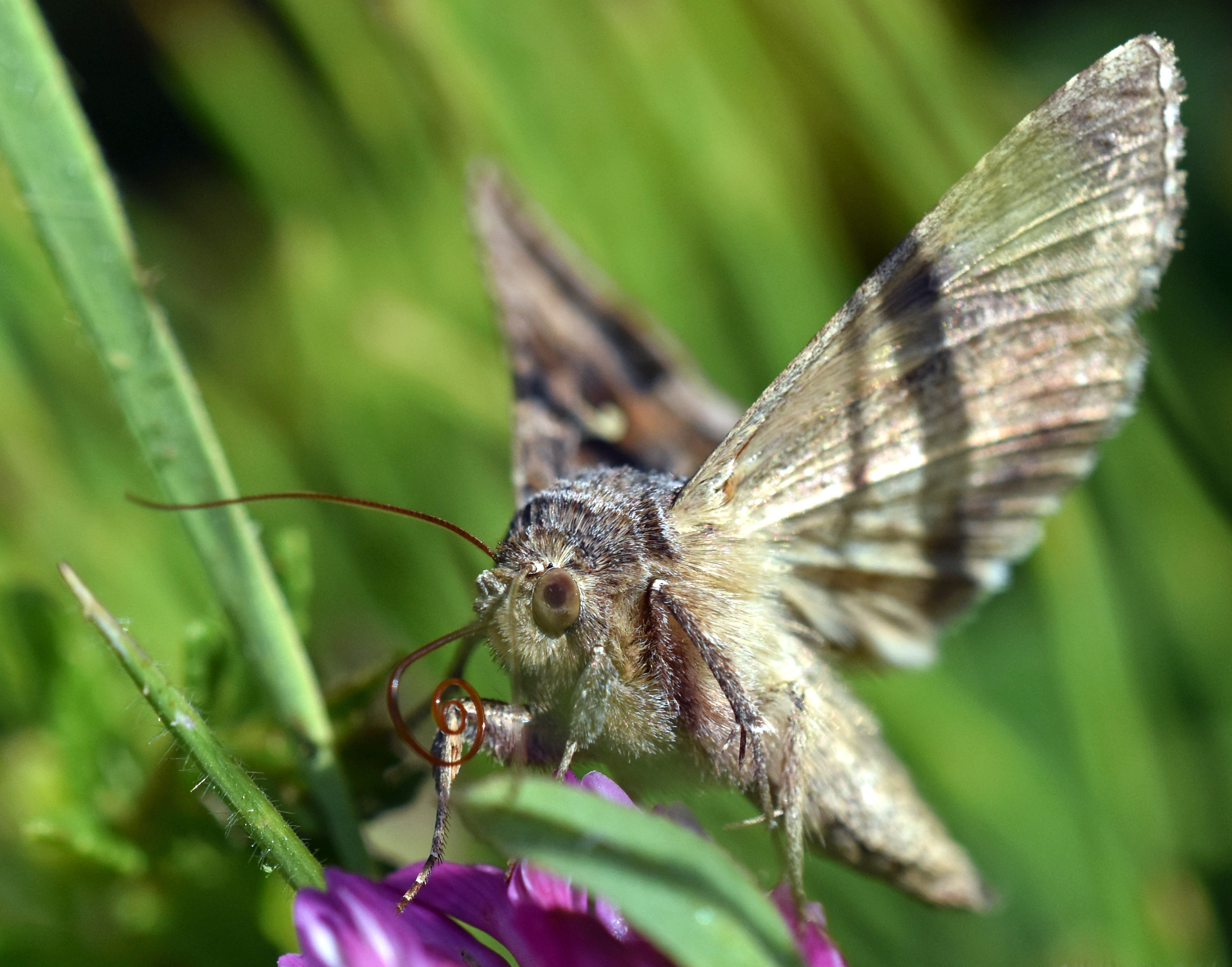 The Silver Y moth, Autographa gamma (Linnaeus) is an immigrant to the UK, coming here to feed, breed and fly away again each year. It rarely stays over winter; it’s just too cold here for its liking! In reality, we (the United Kingdom) are just a stopping off place on a seasonal journey which takes it each year, from North Africa and the Mediterranean to northern Europe, and back again. Moving up and down the globe is concert with the seasons.