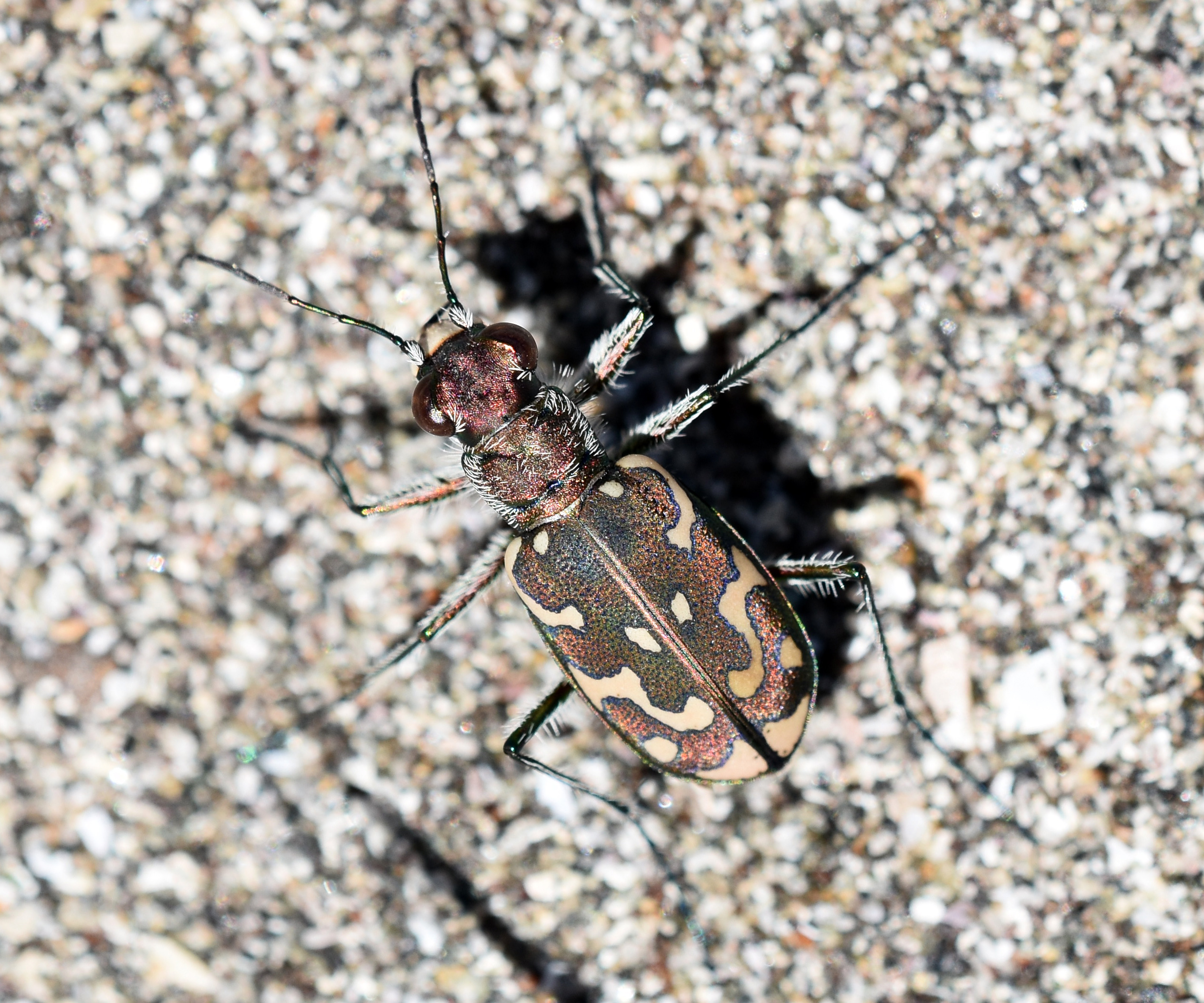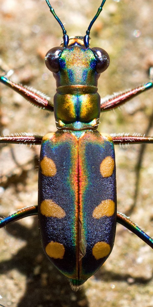 Tiger beetles (Cicindelinae) are strikingly beautiful predatory insects which come in a bewildering variety of stunning colours: iridescent, metallic greens, reds, blues and so on. Researchers have speculated about the function of these gorgeous colours and have come up with theories to do with crypsis (blending in), disruption by iridescence (dazzle!), mimicry (trying to look like something else), and thermoregulation (regulating their body temperature). For example, the iridescent colours of some species might be acting as an aposematic or warning coloration; a message to other would be predators that they are highly distasteful (some tiger beetles produce cyanide!) and best avoided!