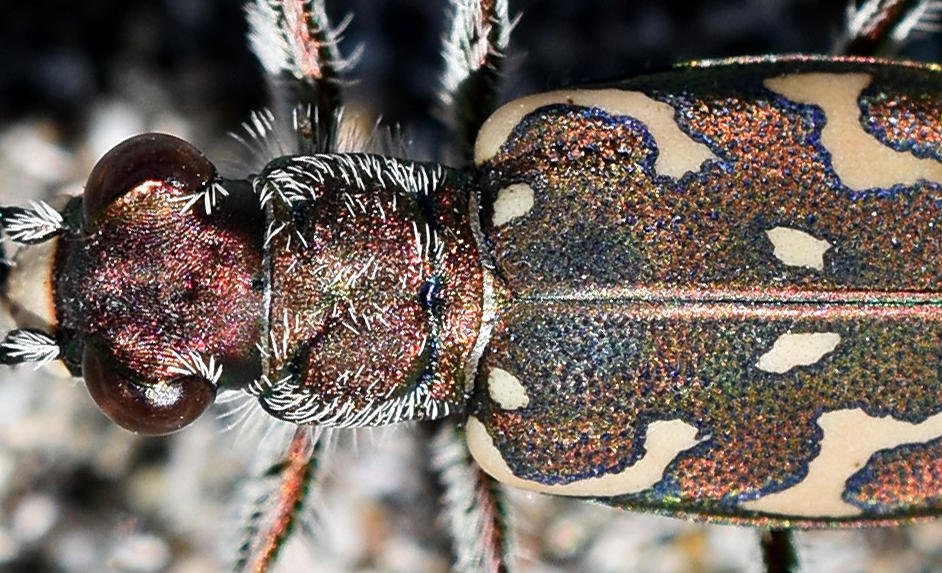 The colours themselves are structural in nature, meaning that they and are caused by a specific cuticular morphology (Schultz & Rankin 1985a, b). In other words, the elytra of many cicindeline species are covered with an array of closely packed, minute dimples (also called punctae). The reflecting layers within the punctae reflect shorter wavelengths of light and in the words of one researcher: